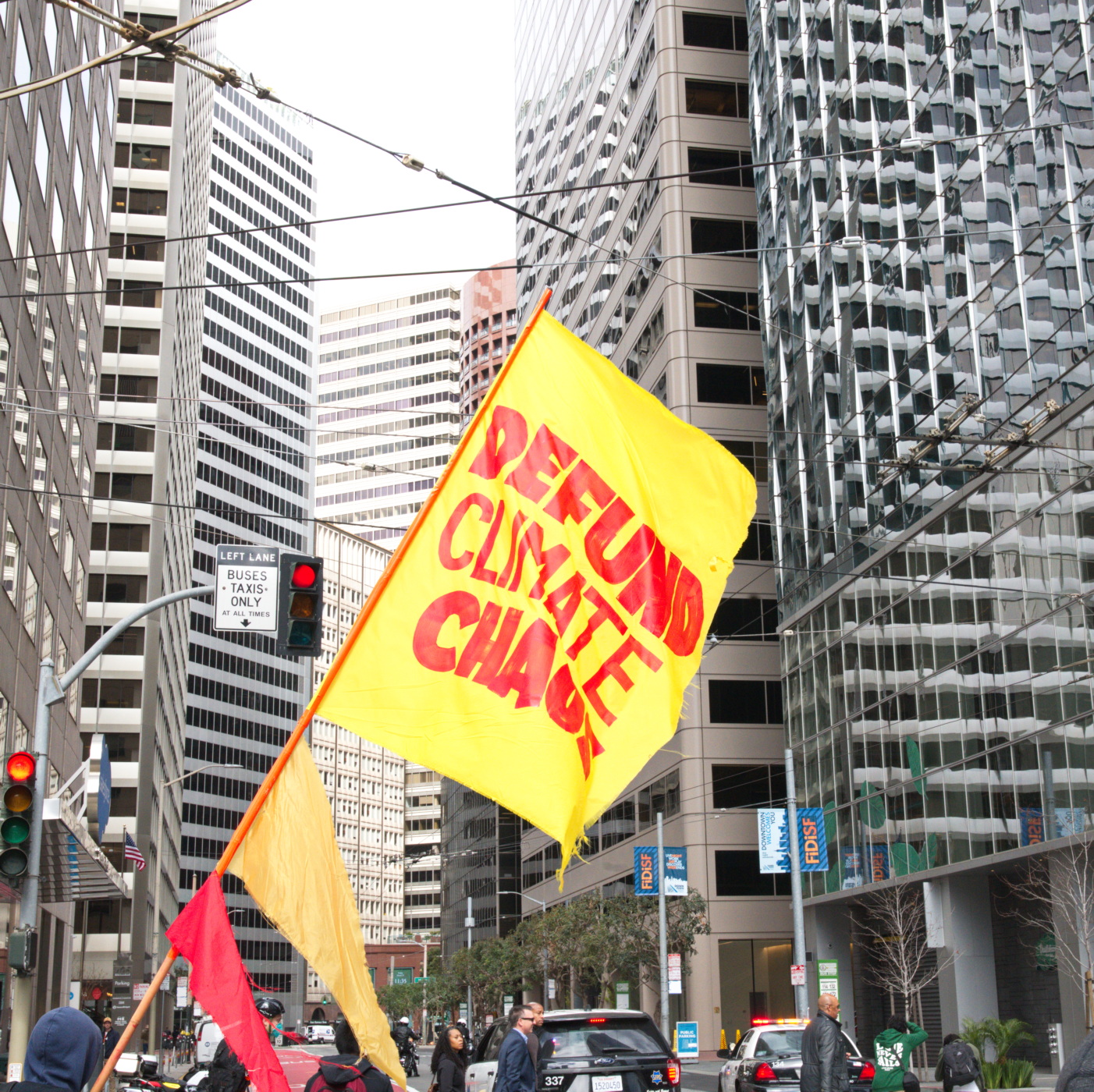 With large banners and many signs they marched down Market Street and over to Blackrock's offices on Howard Street. There they put "bloody" hand prints on the street. They were "respectful" of private property restricting their message to the street though other actions at Blackrock and ICE had applied their message to the front doors and the building. One sign noted that fossil fuels were destroying the "wrong" Amazon. The demonstrators shouted slogans and chants using using many megaphones working together.