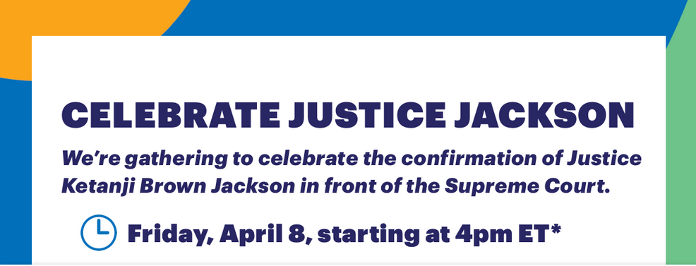 So now, we celebrate! We're happy to invite you to a special livestream event tomorrow at 4 PM to celebrate Justice Jackson’s confirmation. (If you’re in the DC area, please join us outside the Supreme Court in person!)