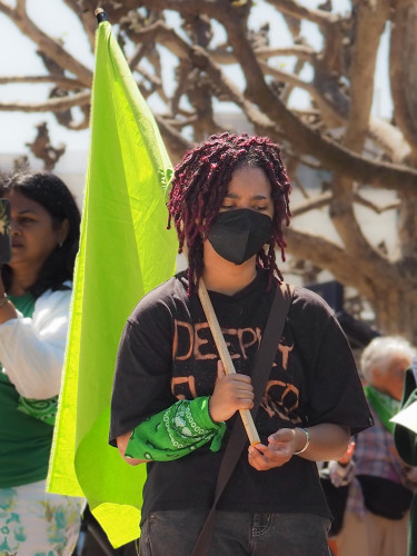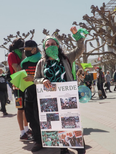 Demonstrators for abortion rights and reproductive justice sported green bandanas and waved green flags in front of historic Sproul Hall, the iconic site of the 1960's free speech movement. The Green Bandana is a symbol for abortion rights throughout Latin America. Through sustained protests that have been called a “Green Wave” women in Argentina, Colombia, and Mexico have succeeded in decriminalizing abortion.