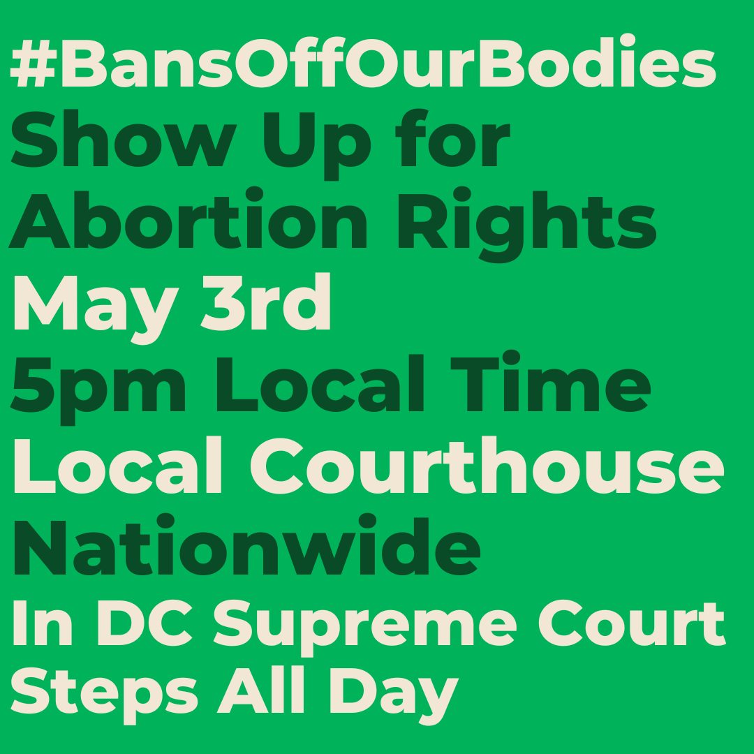 On Tuesday, May 3 at 5pm, local time, we're calling on Women's March supporters across the country to head to your local federal courthouse, federal building, town hall, or town square. We're showing up to defend abortion rights, say bans off our bodies, and demand elected officials take action before the right-wing justices on the Supreme Court overturn Roe v. Wade. Bring your families, your signs, your stories, your heart, and your commitment to save Roe and access to safe and legal abortion for all who need it.