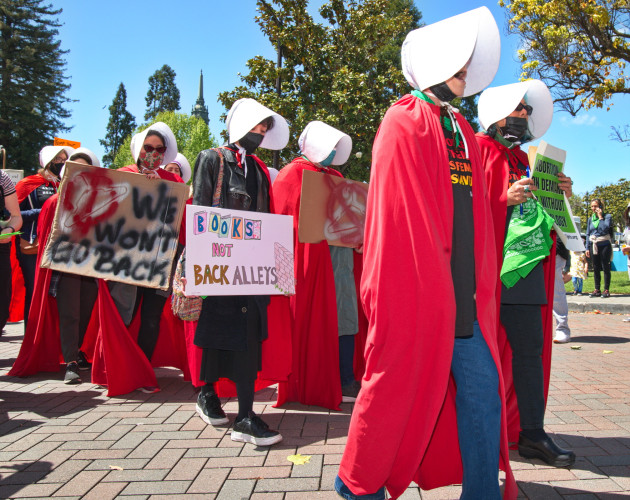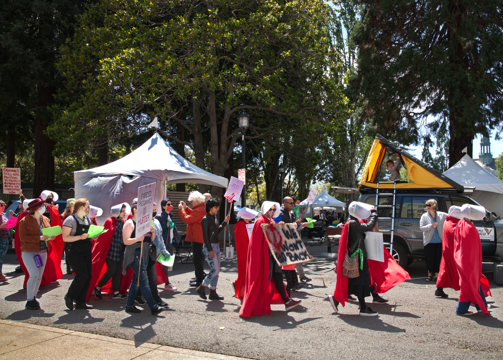 Dressed in handmaiden costumes and carrying signs that did not mince words such as "Scotus go fuck yourself", "forced pregnancy is murder" and "hands off my body" they march through the Bay Area Book Festival and downtown Berkeley.For many of the Grannies, having lived through the darkness of pre Roe America, their message carried additional force. The crowd was receptive, snapping up the green distributed leaflets. Unlike several recent similar demonstrations, mainstream media was there, shooting video and interviewing several demonstrators.