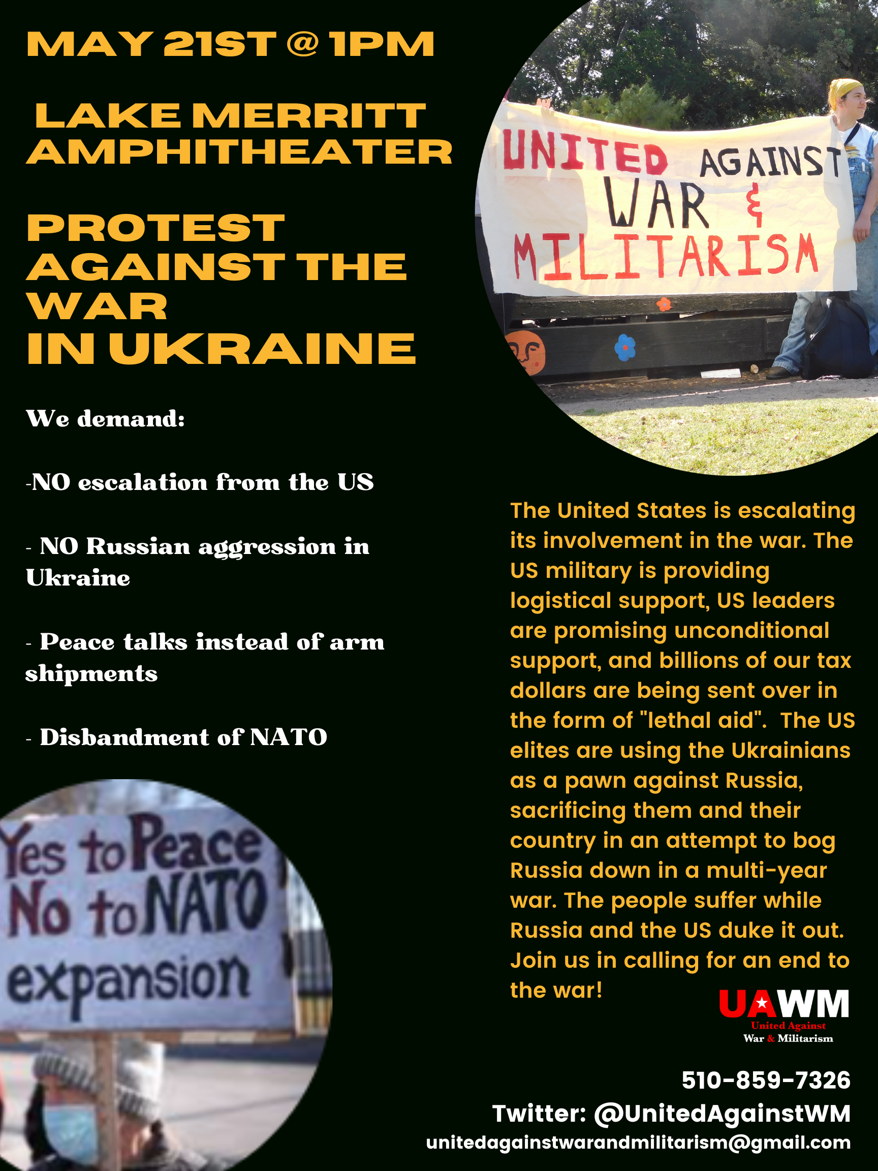 The United States is escalating its involvement in the war. The US military is providing logistical support, US leaders are promising unconditional support, and billions of our tax dollars are being sent over in the form of "lethal aid". The US elites are using Ukrainians as a pawn against Russia, sacrificing them and their country in an attempt to bog Russia down in a multi-year war. The people suffer while Russia and the US duke it out. Join us in calling for an end to the war!