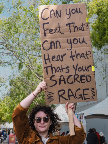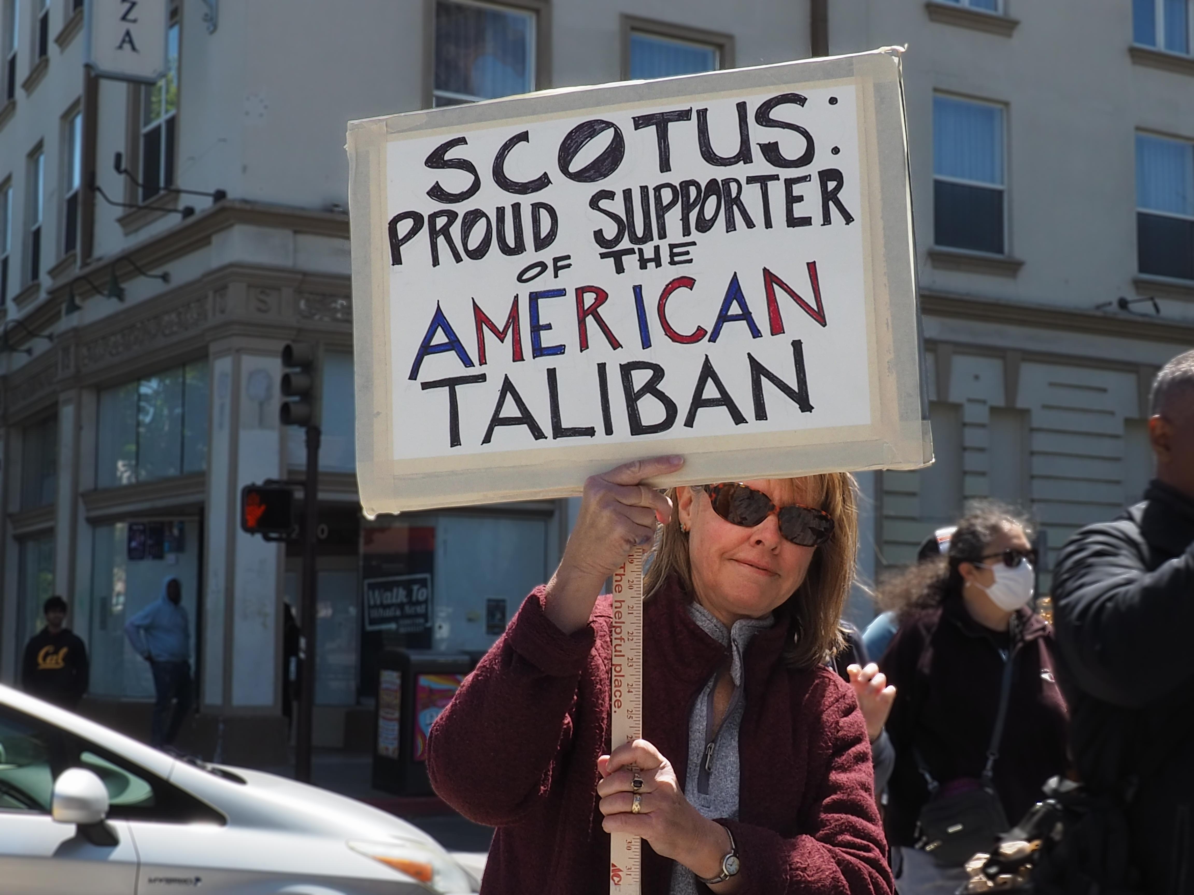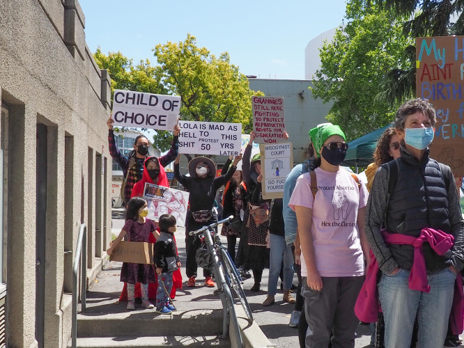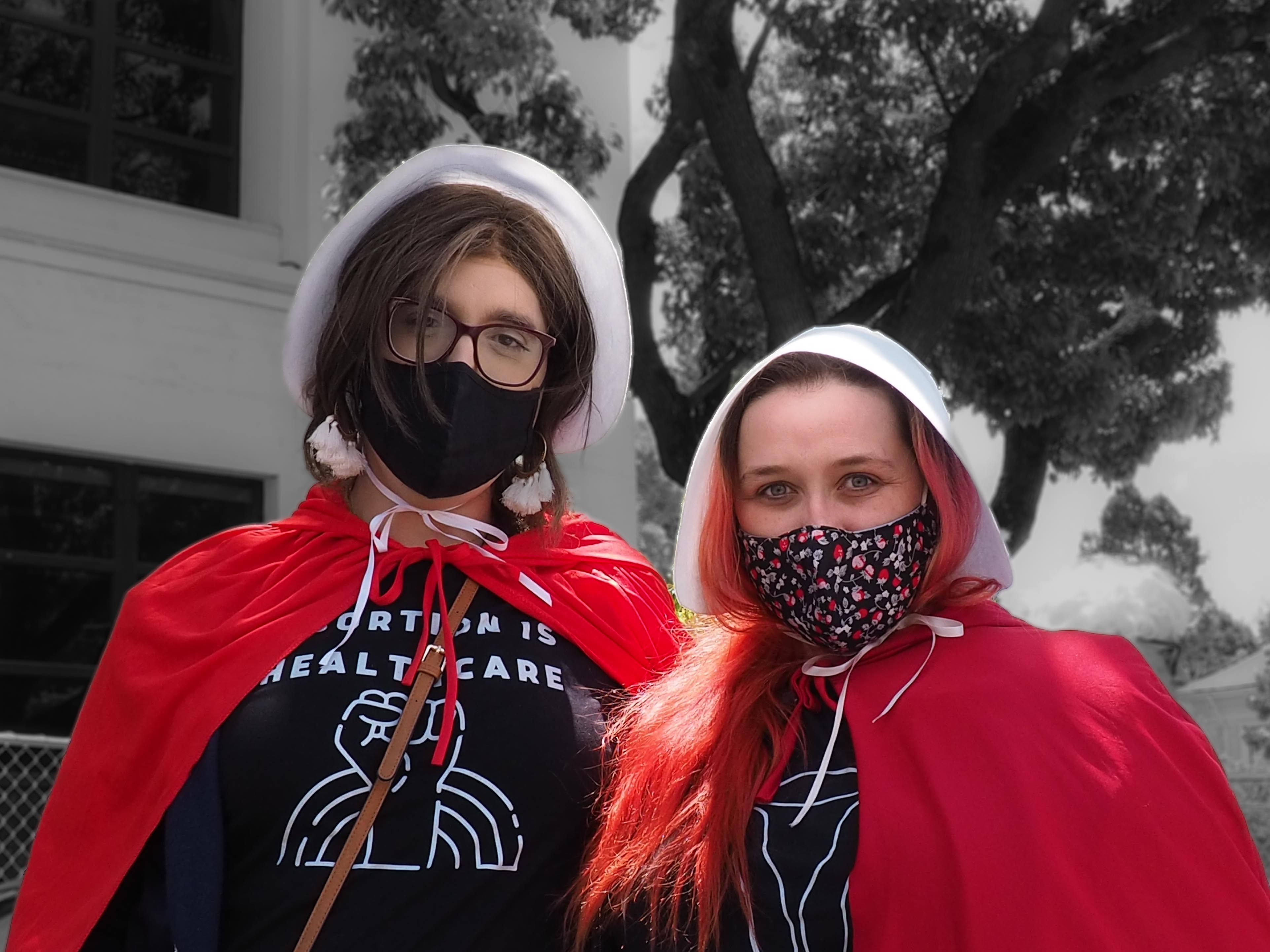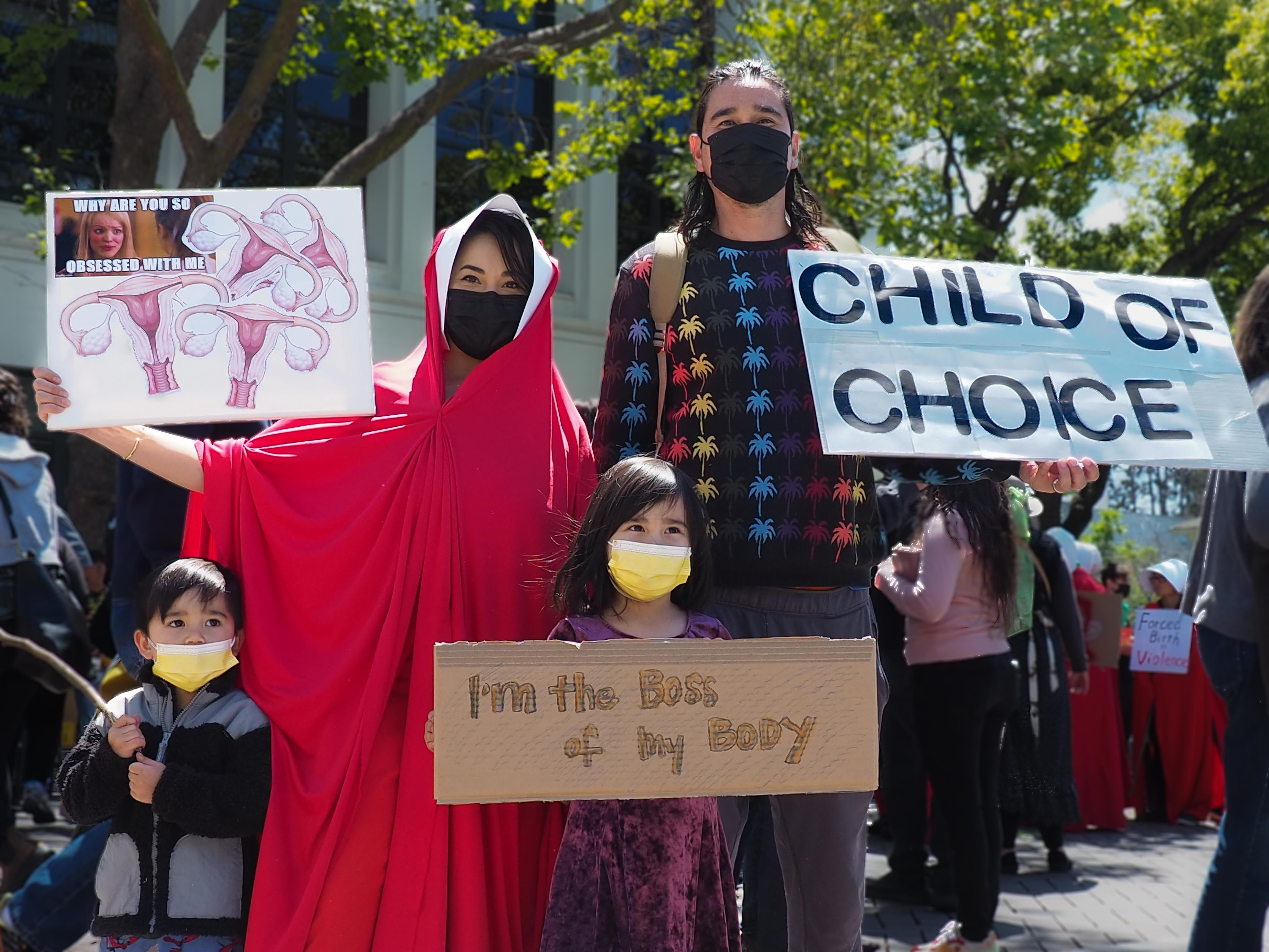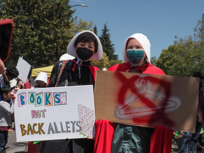 Berkeley book lovers are naturally furious about the threat to reproductive justice and many joined the marchers that took to the lanes of the Bay Area Book Festival on May 8. Festival customers dove right in to the procession; demo organizers were at the ready to help them costume up.