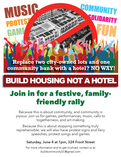 Join in for a festive, family-friendly demonstration in support of affordable housing and to oppose the construction of a luxury hotel at the Santa Cruz Community Credit Union building and the two adjacent City-owned lots.
