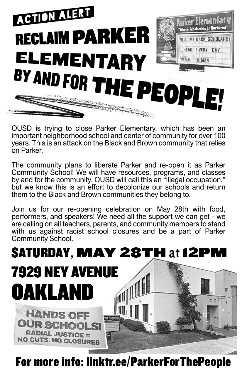 Students, parents and teachers have occupied the Oakland Parker Elementary school to stop it's closure and other Oakland schools. There will be community labor solidarity with their action on Saturday May 28, 2022.