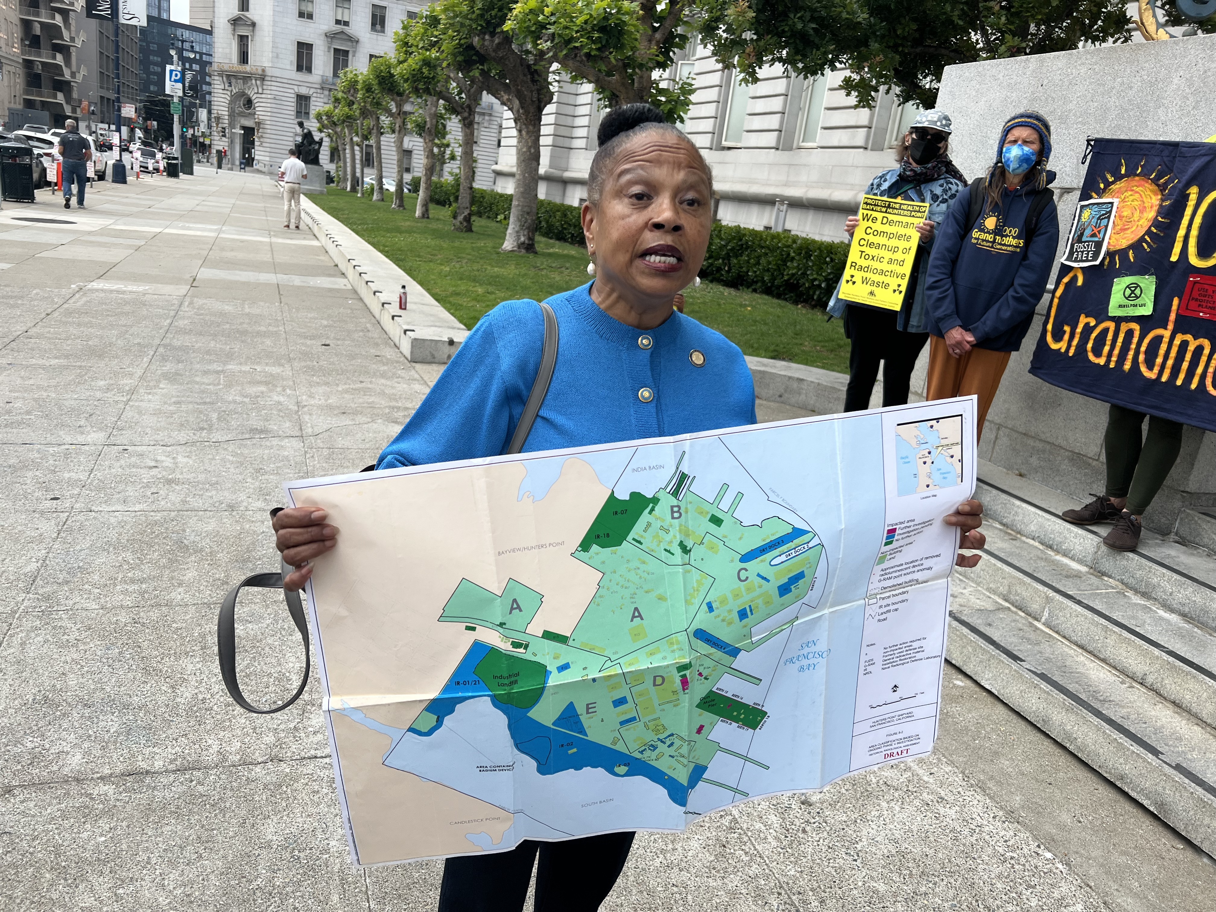 Hunters Point residents and community members rallied at San Francisco City Hall on June 3, 2022 to support a San Francisco's Grand Jury report that said that there had been no real oversight of the development of Hunters Point superfund sight. Over $1 billion of US government funds have already been spent to remediate the site as well as Treasure Island but as a result of fraud by Tetra Tech and Test America and retaliation against many OSHA and health and safety whistleblowers, the site continues to be contaminated. The speakers also talked about the capture of government regulatory agencies by Lennar and other developers and their collusion with politicians who have allowed this development.
