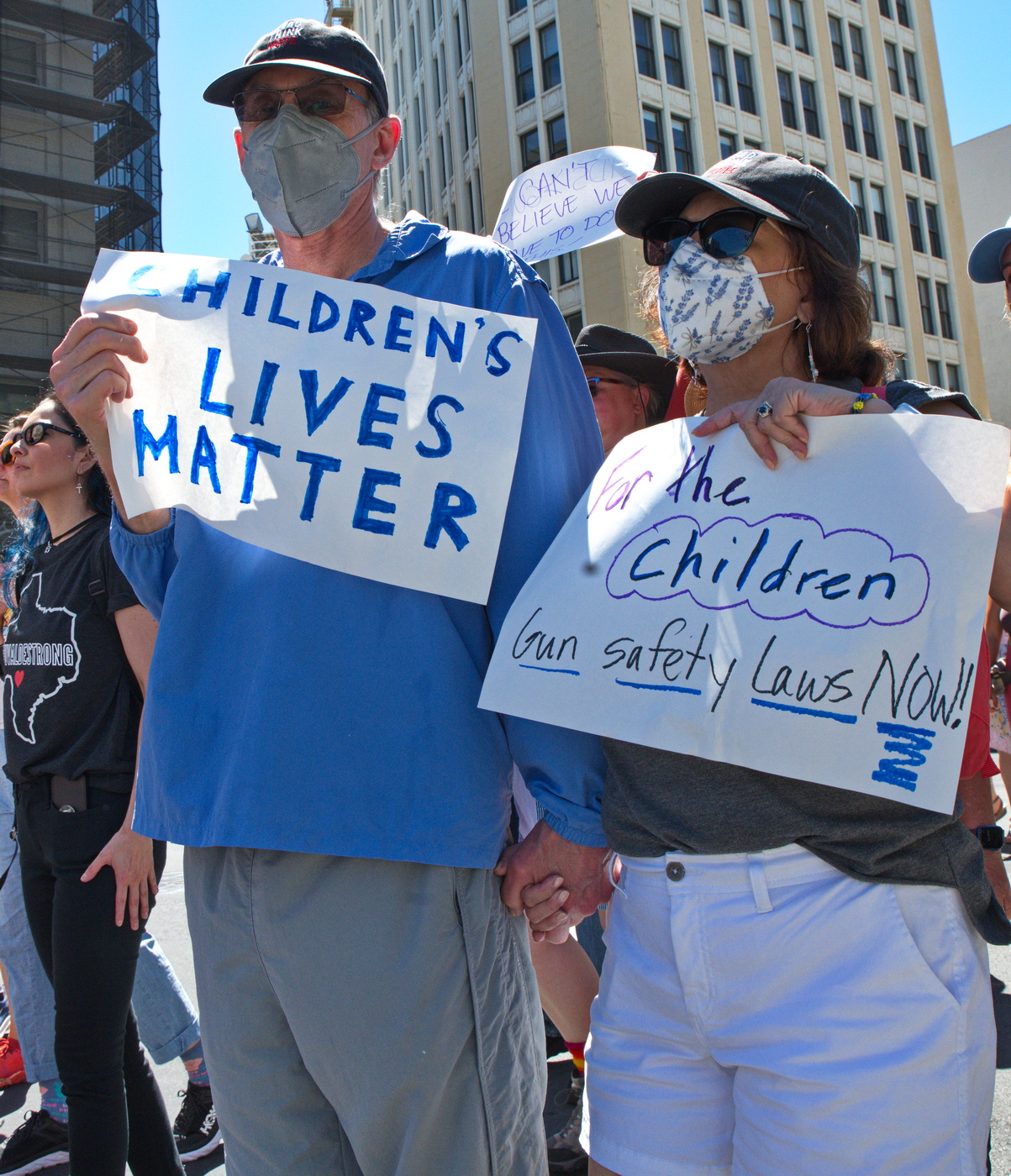 "Funny how when it comes to guns, the All Lives Matter crowd suddenly goes quiet" said one sign. Many signs contrasting the Right's attempts to control women's bodies while allowing weapons of war to proliferate. "Arms are for hugging" proclaimed others.