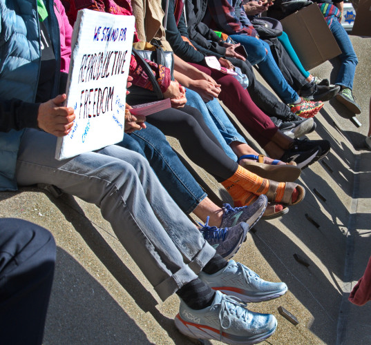 The crowd was angry as they faced the line of police in front of City Hall, repeatedly shouting slogans like "Abort the Court!". Several speakers told of horrendous experiences in the days before Roe v Wade. Many signs called out the contrast between gun rights and women's rights.