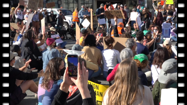 Starts off with excerpt from speech by Honey Mahogany at rally at Philip Burton Federal Building on June 24 the day the Supreme Court overturned Roe v. Wade. That rally turned into a march to Market at 8th where hundreds sat in the street for 49 minutes. The number of minutes was chosen to represent the number of years Roe v. Wade was law of the land.