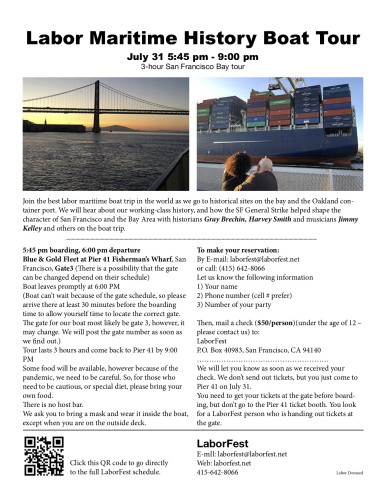 Join the best labor maritime boat trip in the world as we go to historical sites on the bay and the Oakland con- tainer port. We will hear about our working-class history, and how the SF General Strike helped shape the character of San Francisco and the Bay Area with historians Gray Brechin, Harvey Smith, Gifford Hartman, Labor Photographer Joseph Blum, and musicians Jimmy Kelley and others on the boat trip.