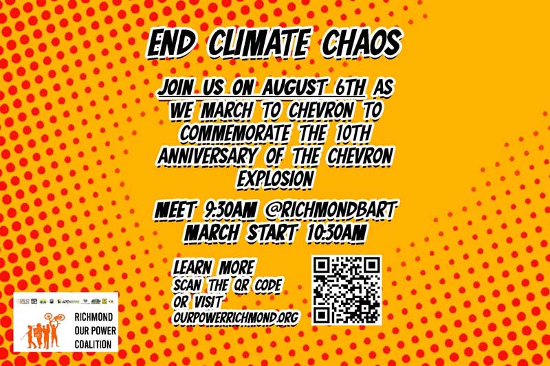 On Saturday, August 6, hundreds of Richmond residents are coming together to commemorate the 10-year anniversary of the 2012 Chevron Refinery Fire. We will be marching to Chevron to send a message that we REFUSE another 120 years of violence on our bodies, our communities, our air.
