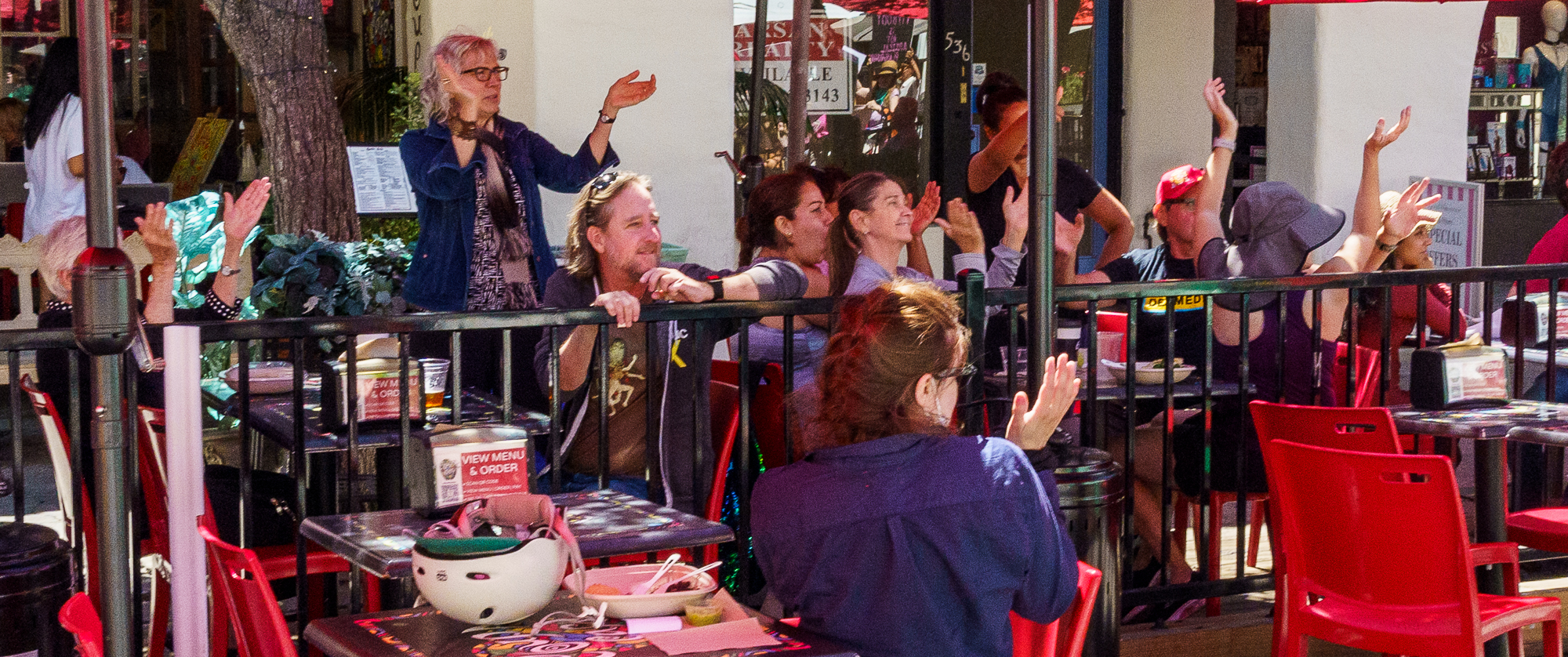 On August 8 demonstrators marched on the major streets of University Ave and Hamilton in downtown Palo Alto. They were cheered on by many shoppers and diners, particularly when they marched through the outdoor dining area along Ramona St.