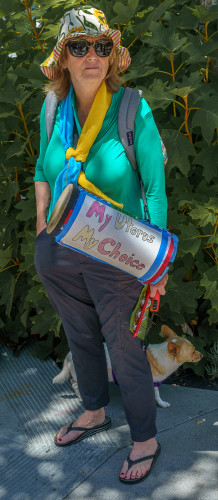 Keeping things colorful and interesting, demonstrators wore butterfly costumes and/or granny hats. Others donned green bandanas or t-shirts. Animal companions hung out in the shady parts of Lytton Plaza; one dog took his place right under the lead green banner keeping pace with the marchers.