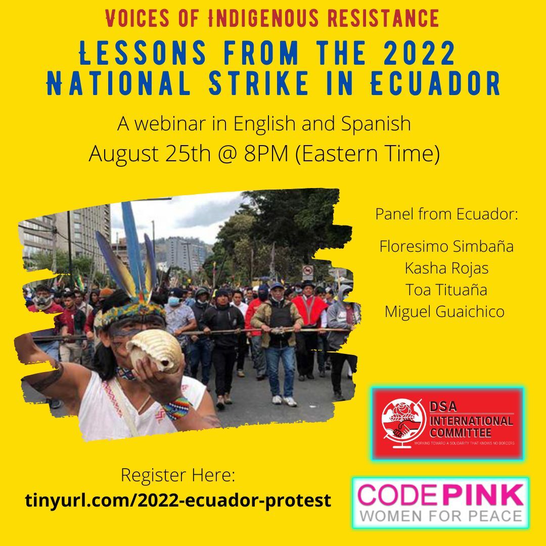 To register:http://tinyurl.com/2022-ecuador-protest or https://act.dsausa.org/signup/2022-national-protest-in-ecuador/