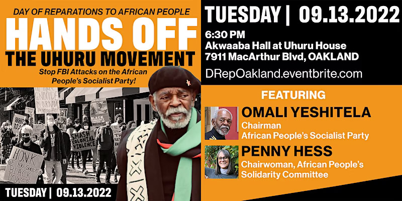 He’ll be back in Oakland to speak at the September 13th “Day of Reparations to African People - Oakland”, an annual Uhuru Solidarity Movement event to raise reparations from the white community for Uhuru Movement programs around the U.S. and the world, including community gardens, an African women’s health center, “One Africa, One Nation Marketplaces”, a community basketball court and outdoor event venues, workforce training and housing for African people coming out of prison, along with a community radio station and licensed community kitchens.