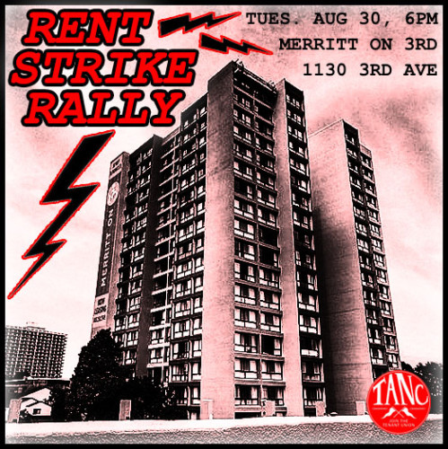 The Merritt on 3rd Tenant Council and Tenant and Neighborhood Councils (TANC) present speakers and banners at a rally at the 1130 3rd Ave. building on Tues., Aug 30, 6pm.