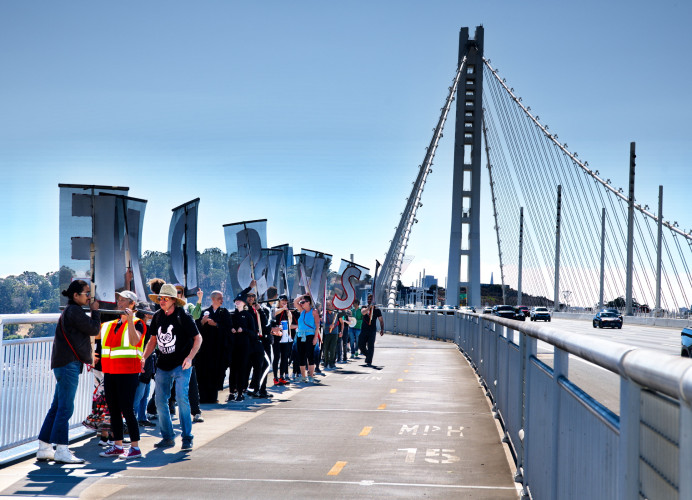 Marchers assembled at the Oakland end of the Bay Bridge bike path. They donned large letter signs and held white carnations. While careful to avoid misspelling the slogan they marched the several miles to the cables connecting the roadway to the large tower. Passing cars frequently honked their approval. Returning to their cars, both marching species enjoyed an afternoon snack.