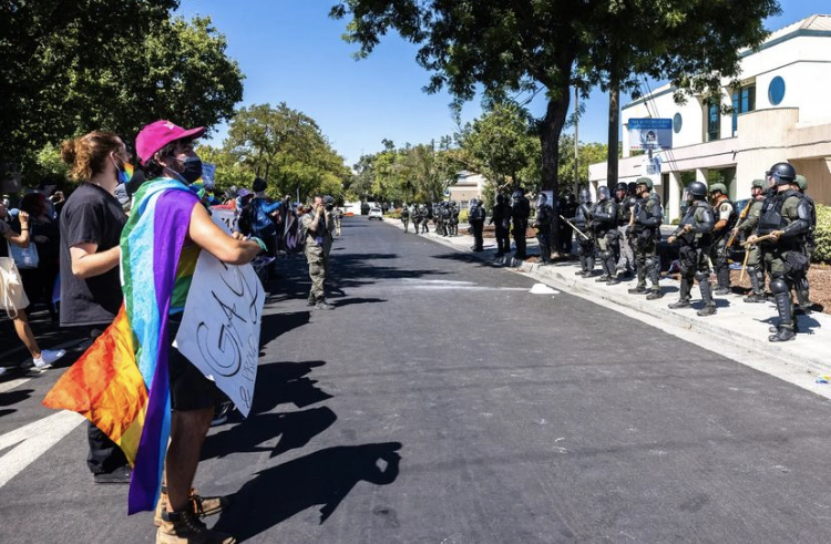 After about 20 minutes, police declared the scene an “unlawful assembly” justifying this move by saying that a shrub was lit on fire and that fights had broken out. A demonstrator who was on the scene said that the fire was actually smoke bombs, without saying which side launched them.