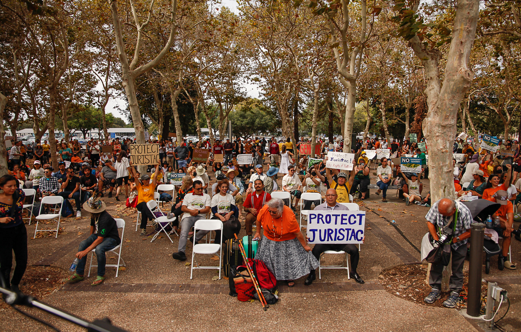 “Our traditional stories tell us that if all the people get together, and they follow a plan, and do it the correct way, we can overcome anything,” Amah Mutsun Vice Chair Ed Ketchum told the crowd. “We can overcome this evil that’s upon us now, and we can protect Juristac. No sand pit!”