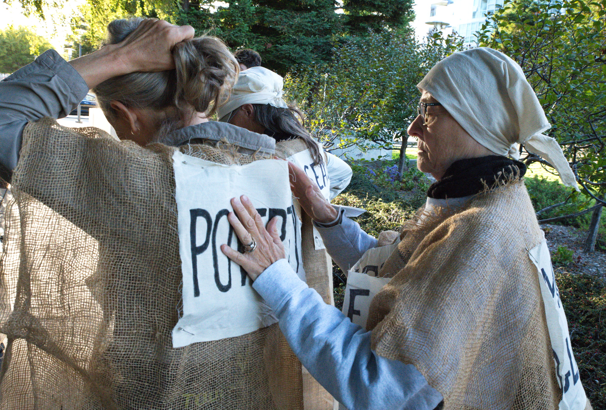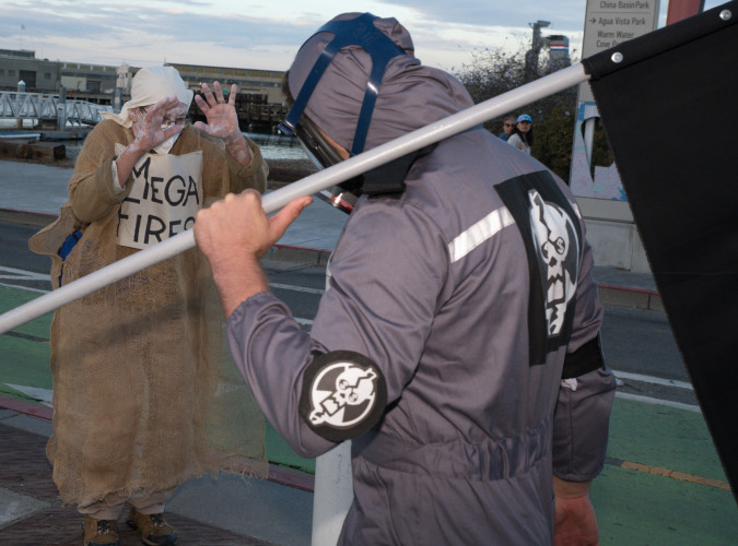 Activists attempted to display a banner inside the Center and were dragged out and ejected, providing effective video by Alice M.. The action included an art gallery where photojournalist and Paradise resident, Allen Myers, displayed his photos of friends and family standing in the ashes of their homes. Myers said, “I've watched the climate change in my lifetime. We know climate change played a role in the Camp Fire. These photos show the face of the climate crisis and that it is here, right now in California, and the companies funding this crisis have got to be stopped."