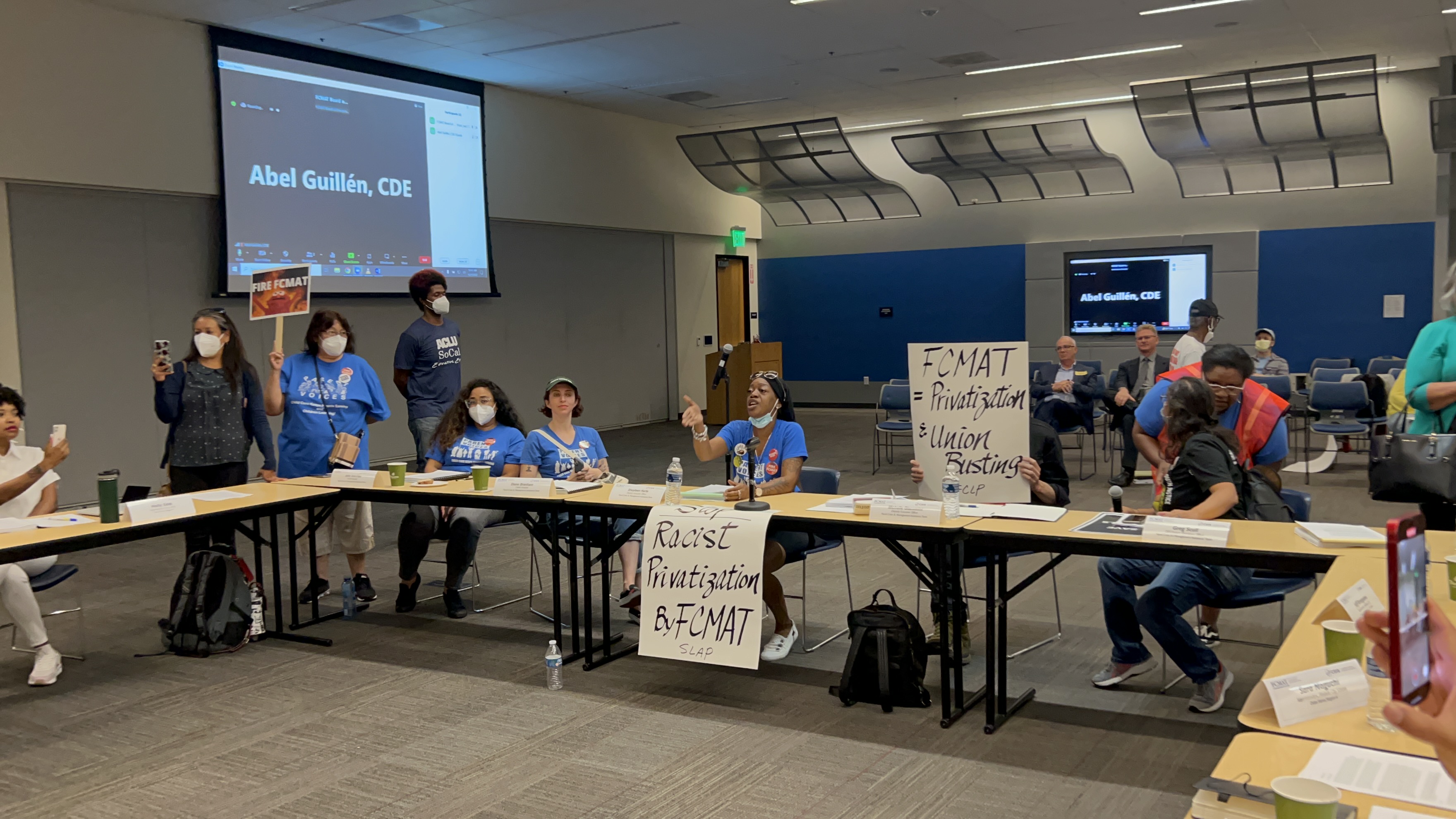 Community activists, kids and public education supporters protested at the LA meeting of FCMAT. They spoke out and shut it down when the FCMAT refused to provide answers.