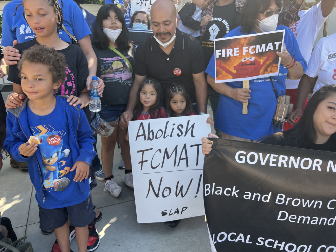 Dozens of parents, students, teachers and public education advocate from around the state rallied and spoke out at the meeting of FCMAT Fiscal Crisis & Management Assistance Team (FCMAT) in Downey at the Los Angeles County Board of Education. They were from the Ingelwood School District and the Oakland Unified school district.