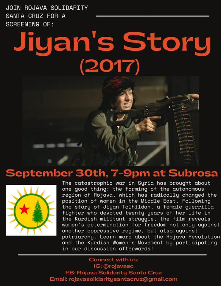 Join us for a screening of “Jiyan’s Story” on Friday, September 30th from 7-9pm at Subrosa.