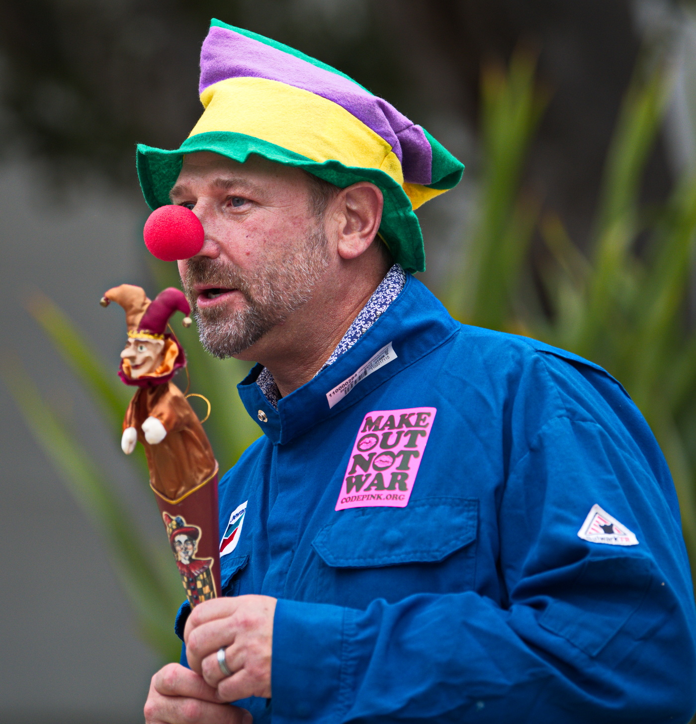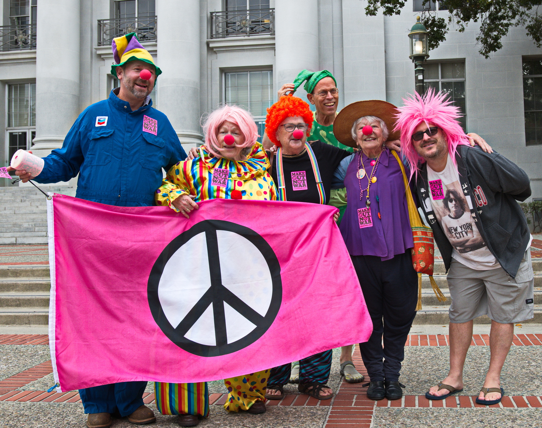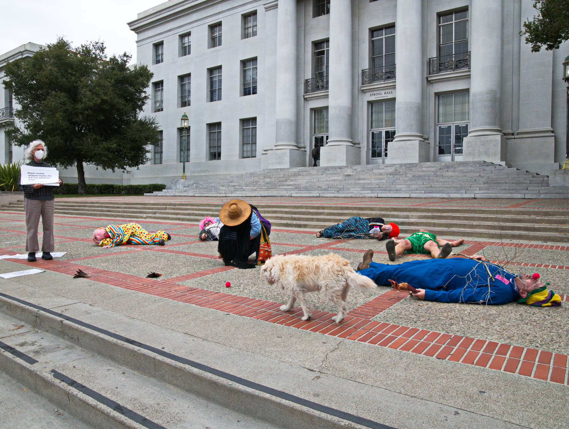 Anti war activists in clown costumes and funny hats dramatized the folly of even THINKING about starting a nuclear war.With "Duck and Cover" drills, die-ins and simulating a Nuclear Winter with "dead" birds falling on the ground, they showed how insane and dangerous the situation is between Russia and the USA. The two most heavily armed nuclear countries are playing a game of "chicken" with the future of life on earth.