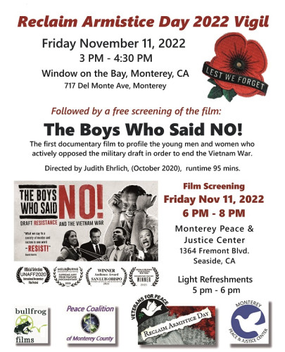 Bring signs, bells, drums, and banners to celebrate with Veterans For Peace Chapter 46 and the Peace Coalition of Monterey County. Afterward, regroup at the Monterey Peace Center, 1364 Fremont Blvd. in Seaside at 5 pm for refreshments and social time, followed by a free documentary film screening of “The Boys Who Said NO!” at 6 pm.