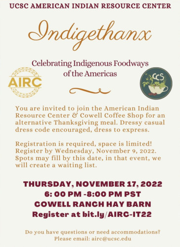 Join the American Indian Resource Center & Cowell Coffee Shop for an alternative Thanksgiving meal, Indigethanx: Celebrating Indigenous Foodways of the Americas. This event will be held at the Cowell Ranch Hay Barn on Thursday November 17th from 6-8PM.