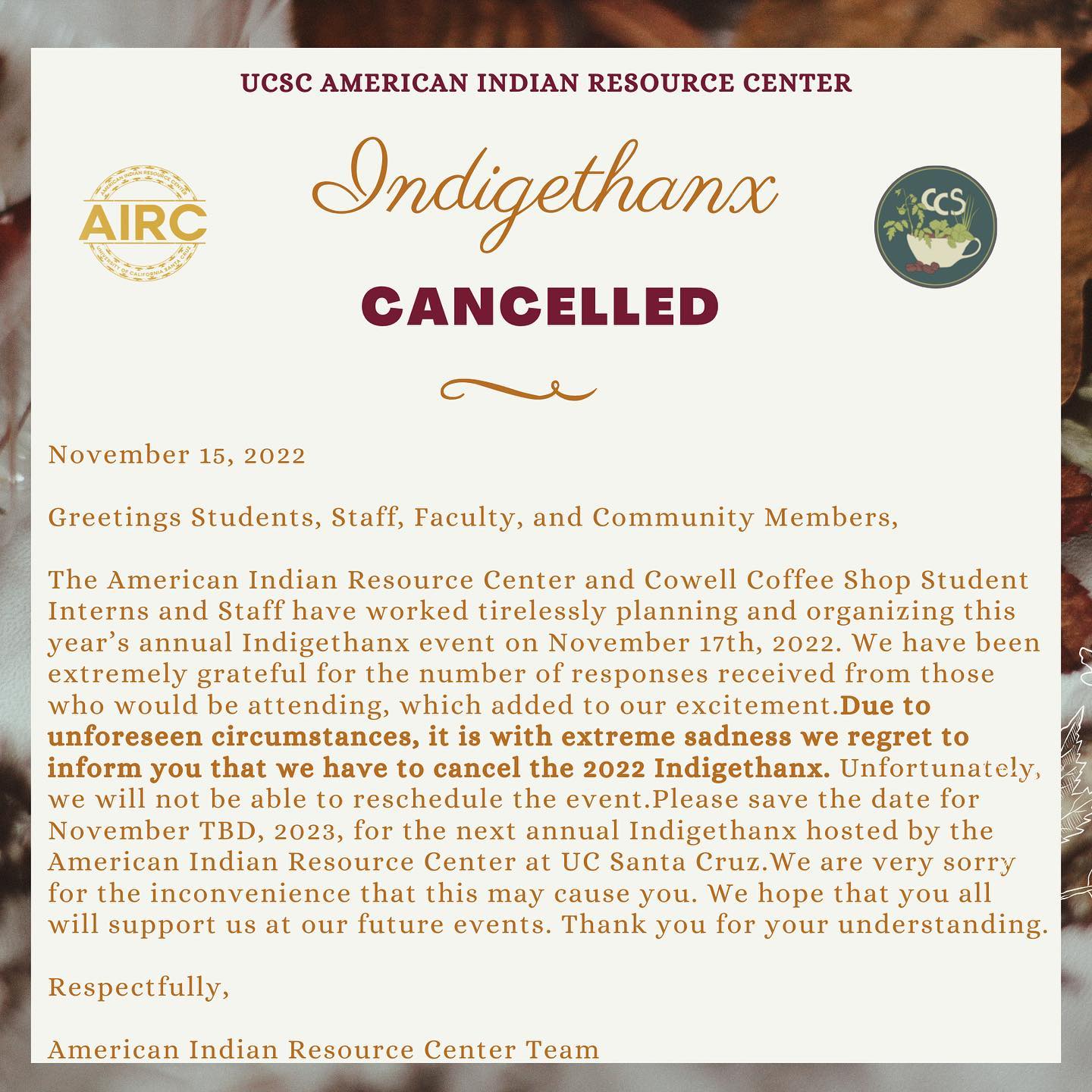Please save the date for November TBD, 2023, for the next annual Indigethanx hosted by the American Indian Resource Center at UC Santa Cruz.