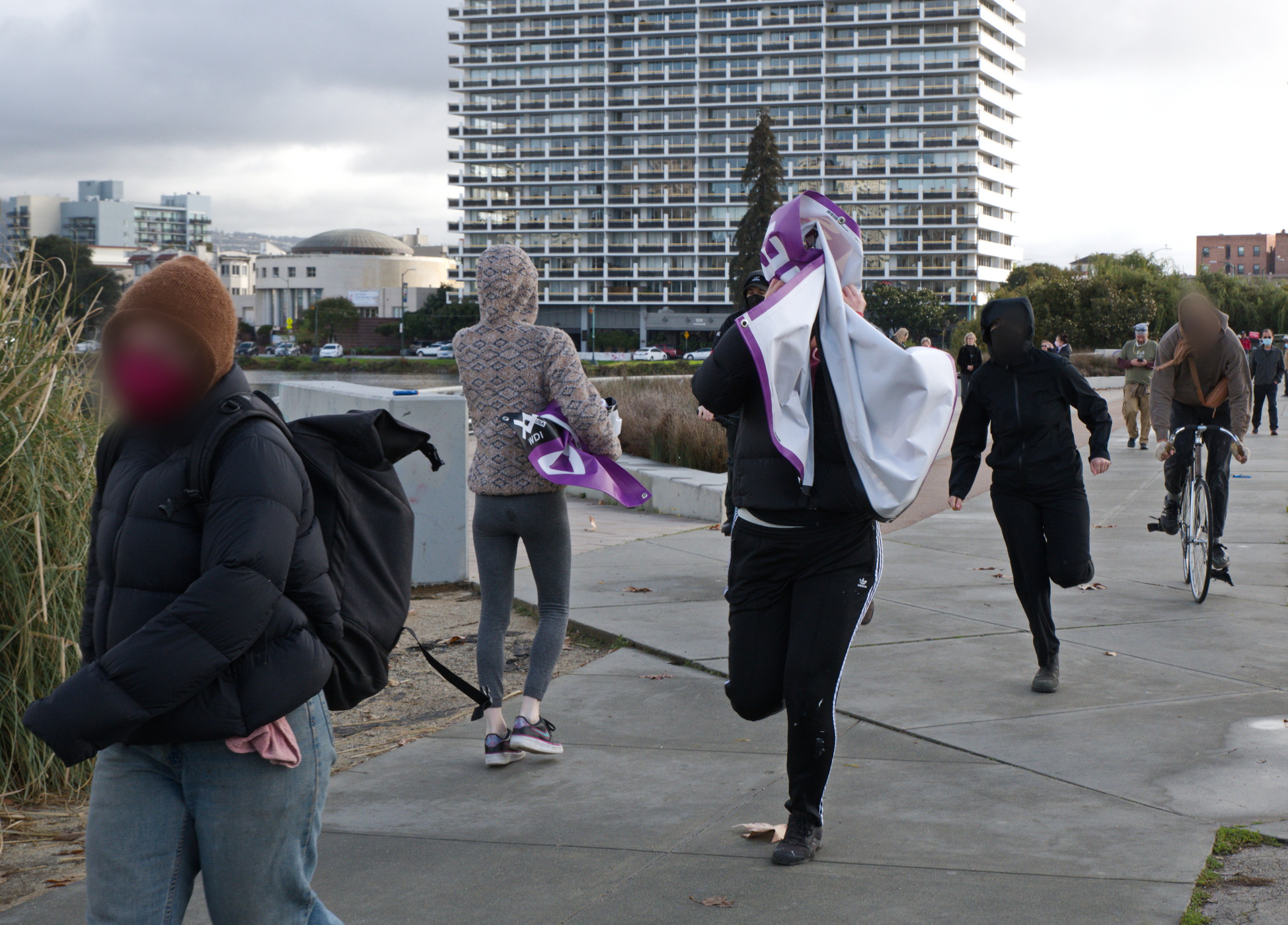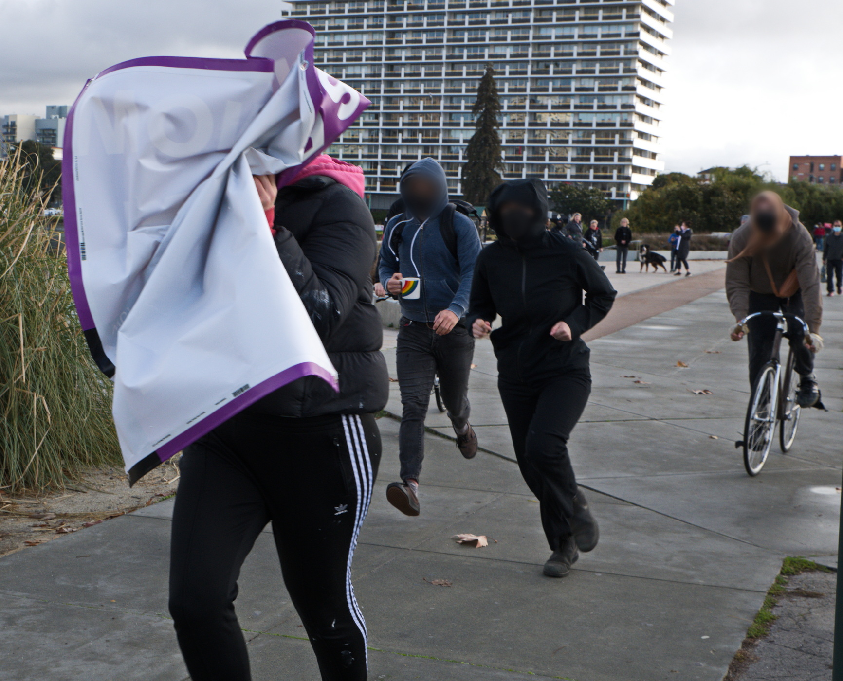 After they moved to the Lake Merritt Amphitheater, a group of counter protesters seized and made off with two of their banners to shouts of "get out of Oakland." They were also pied and egged.