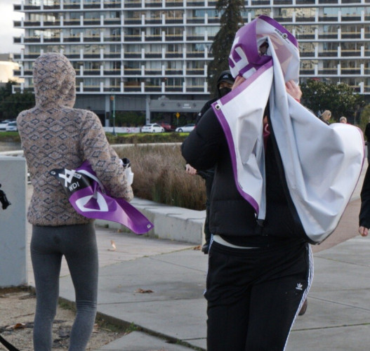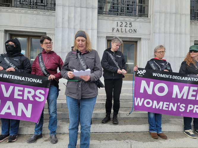 Their "demonstration," which they livestreamed for god knows who, if anyone, was a bizarre show. There were only ten TERFs present. No one else showed up in support of their cause. They stood in a line on the Alameda County courthouse steps holding two banners, while four of them took turns reading their little scripts in dreadfully monotone voices. It came off like some kind of self-gratifying religious ceremony of hate, without candles or incense. [Not going to transcribe their trans-obsessed fearmongering here.]