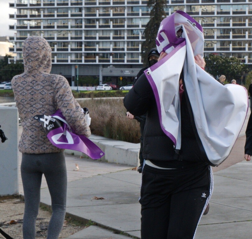 "Get out of Oakland!" was yelled as counter-demonstrators quickly moved in and snatched both of the TERF banners. At least one cream pie was delivered, perhaps two or three. Kara Dansky says she was hit by an egg. It all happened in a matter of seconds. A little tug of war over the second banner and that was it.
