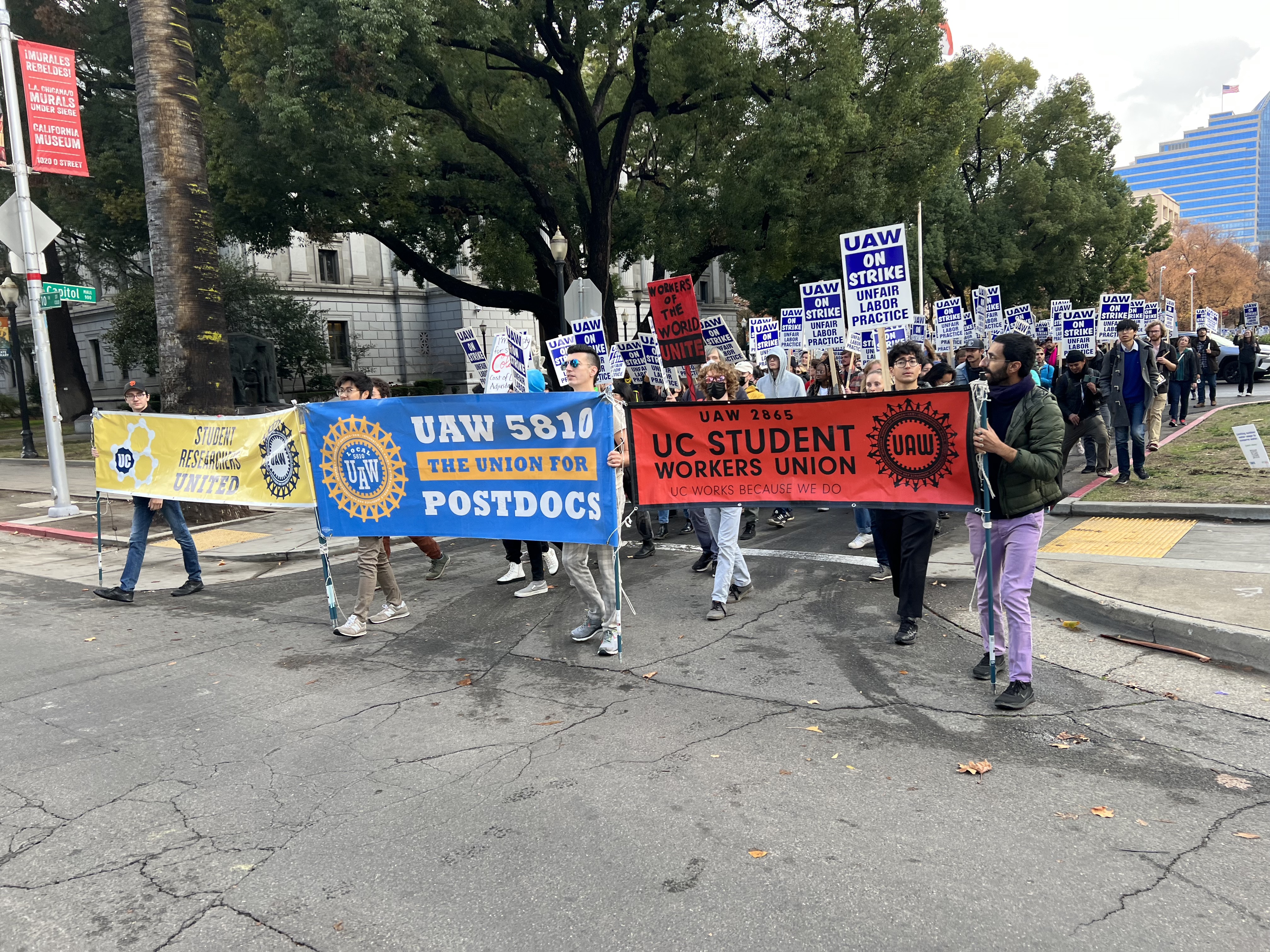 Hundreds of striking UC UAW education workers marched and rallied in Sacramento against the union busting and refusal of the administration to meet their demands for living wages, a COLA and. housing.