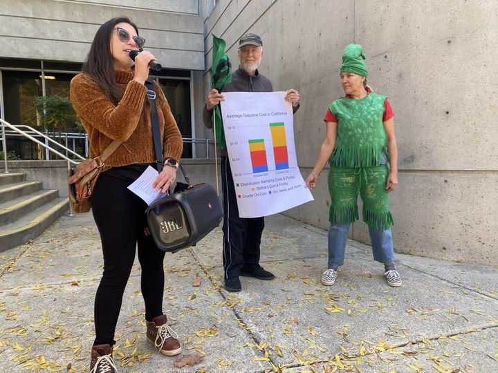 Photo caption: “Big Oil’s callous disregard for the wellbeing of Californians is on full display when they desperately spend millions to keep drilling near playgrounds and schools or jack up prices at the pump to make record profits for shareholders,” said Ilonka Zlatar (L), Organizer with Oil and Gas Action Network, shown here at a recent protest outside of the California Energy Commission in Sacramento. Photo by Dan Bacher.