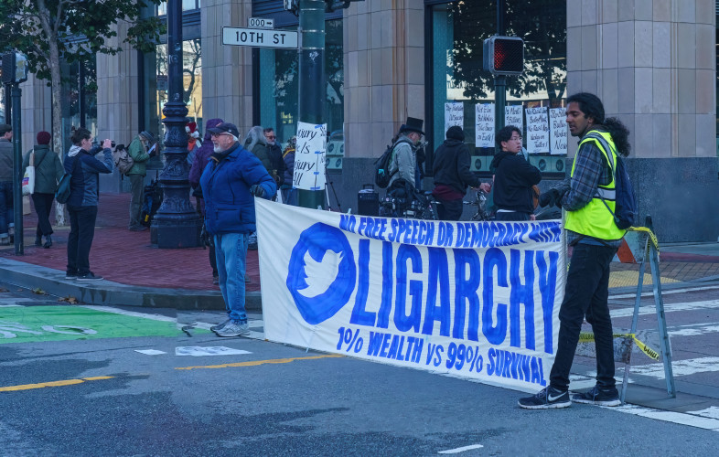 Demonstrators painted a large message on the roadway in front of the headquarters. They placed the Twitter bird in a circle forming the “O” in the word "Oligarchy" spelling out the word on the street in large letters. Speakers at the demo said that is the system when there is no free speech or democracy and people like Musk are multi billionaires.