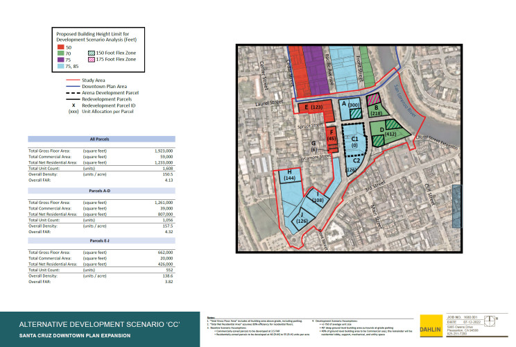 At their June 14, 2022 meeting, the Santa Cruz City Council selected a preferred development scenario for the area (see photos), directing staff to prepare an Environmental Impact Report (EIR) analyzing the potential for environmental impacts of the Downtown Plan Expansion, and to study the following features as part of the project: