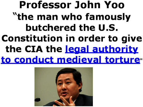 Professor John Yoo is “the man who famously butchered the U.S. Constitution in order to give the CIA the legal authority to conduct medieval torture." He continues to teach at UC Berkeley Law School. He should be prosecuted for complicity in torture and imprisoned. He gave legal justification for torturing Muslim men turned over for bounty to the military for CIA torture at Abu Graib, black sites, and Guantanamo. We are calling for his prosecution. Torture is NEVER legal.