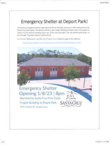 LATE FLASH: The Civic Center Flooding and Wet Weather Emergency Pop-Up Shelter—open for Wednesday, Thursday, and Friday nights—is reportedly closing down in spite of 8" of predicted rain by Monday. A worker reports that folks were ousted at 9 AM on the order of the new Mayor (Fred Keeley), some still unable to secure their property indoors, though staff are within denying entrance (as of 1 p.m. Saturday).