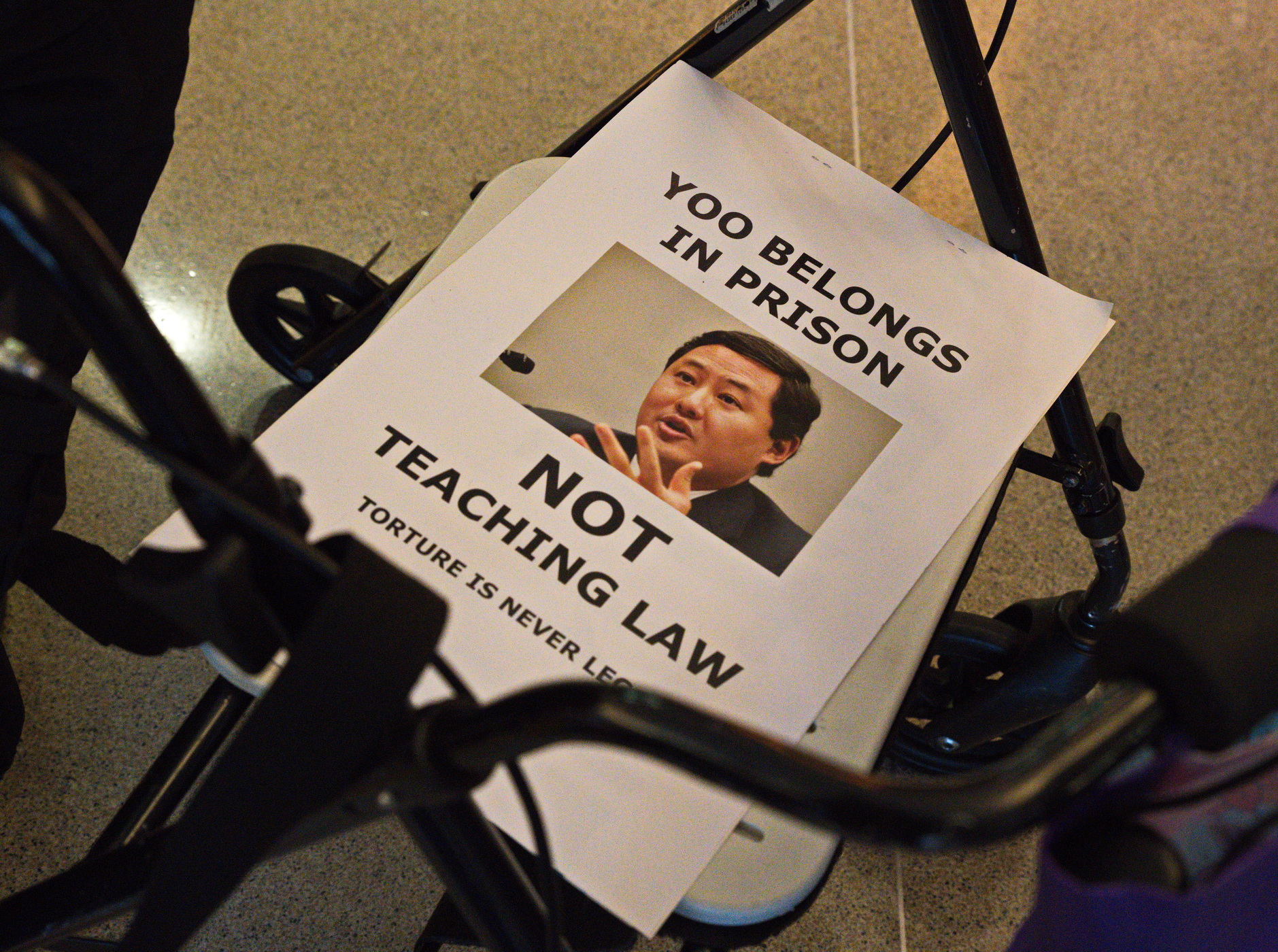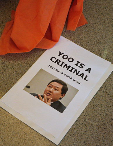 The US has carried out torture at Guantanamo. Professor Yoo is complicit because when he worked at the Office of Legal Council in the Department of Justice he provided the legal opinions that Cheney and Bush relied on to order torture of prisoners at Abu Ghraib, Bagram, Guantanamo and elsewhere. Prosecution for complicity in torture is not discretionary: in other words, our Department of Justice is required to prosecute Yoo. Instead this disgraced lawyer walks free in Berkeley and teaches at our public university, at a salary of nearly $500,000/year.