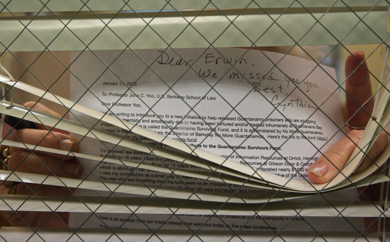 Dean Chemerinsky, the Co-directors of the International Human Rights Law Clinic at the law school, Berkeley Peace and Justice Commission members and law school students have been invited to speak at the press conference. Professor Yoo was be asked to contribute to the newly established Guantanamo Survivors Fund. They did not appear but letters were left for them at the school's office of the dean. A "pie" consisting of shaving cream was prepared by parties unknown but not delivered.