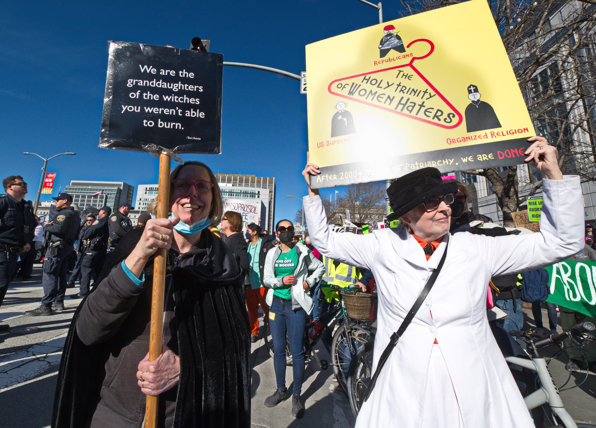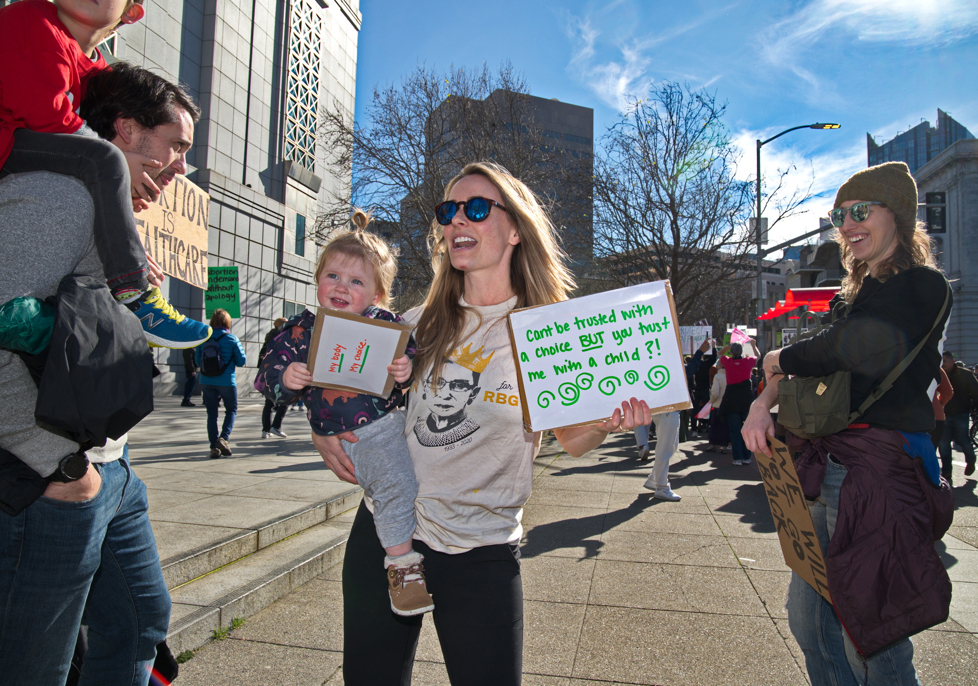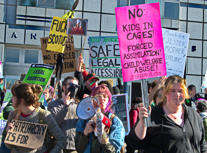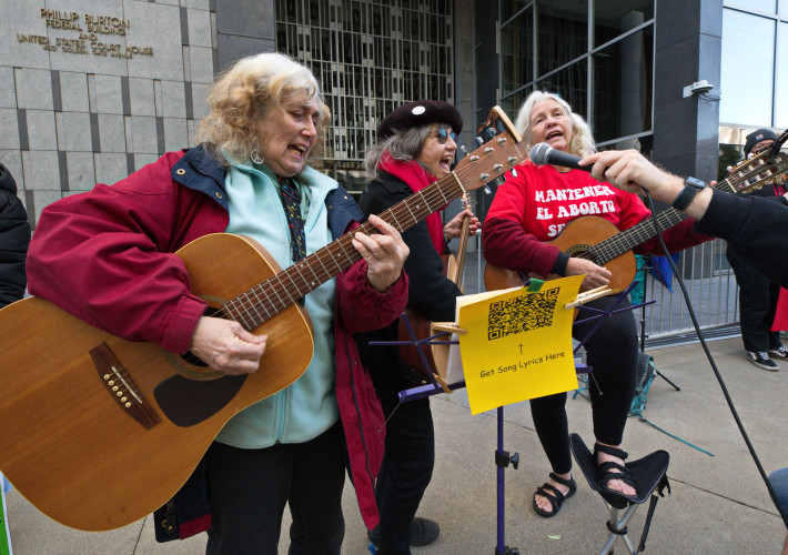 On Saturday January 21, over a thousand pro-choice demonstrators intercepted the Right to "Life" march at San Francisco's Civic Center. Pro choice groups included Rise Up4Abortion Rights, Amnesty International, Iranians proclaiming "Women, Liberty, Freedom", musical group Occupella, the Sisters of Perpetual Indulgence, and assorted Socialists.After a rally at the Philippe Burton Federal Building, they marched to San Francisco Library steps and held another loud rally. Shouted slogans included "Get your rosaries off my ovaries!" and "My body, my choice!" A heavy police presence, while keeping the opposing groups apart, did not prevent a vigorous exchange of views. As the forced birthers began their march, some q-Anon racists joined them. It was unclear as to whether they were an official part of the march.
