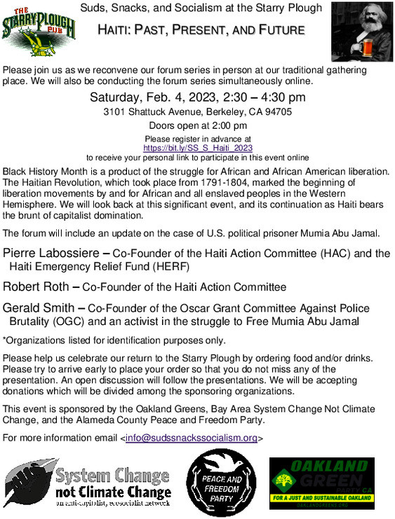 This event is sponsored by the Oakland Greens, Bay Area System Change Not Climate Change, and the Alameda County Peace and Freedom Party.