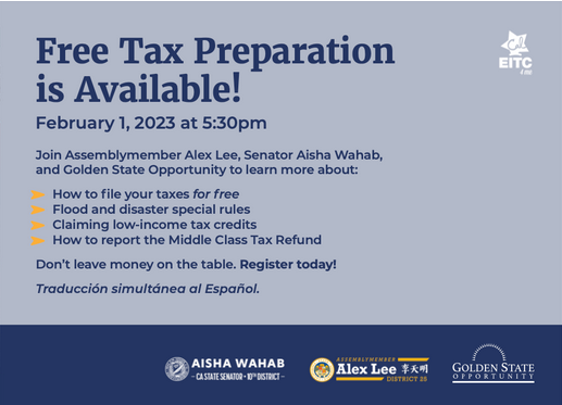 Cubriremos cosas que incluyen la presentación de sus impuestos GRATIS, extensiones de impuestos y reglas especiales de inundaciones y desastres, incluida la deducción y la pérdida por desastre. Los residentes y negocios tanto en el condado de Santa Clara como en el condado de Alameda afectados por las severas tormentas de invierno son elegibles.
