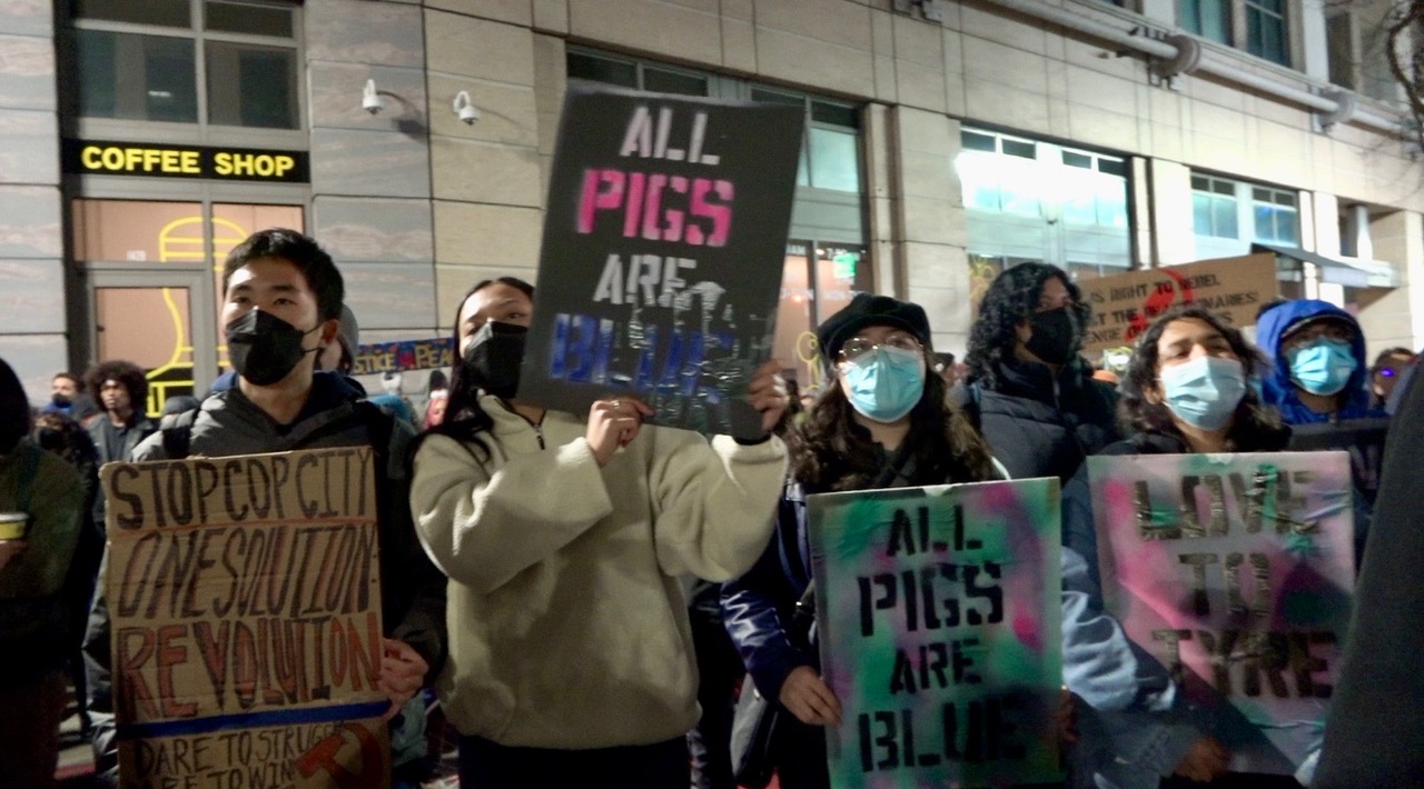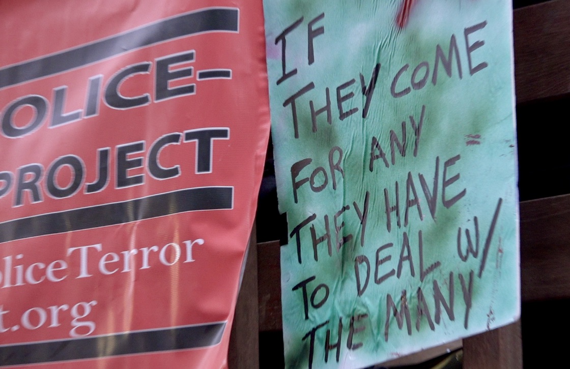 Some of the signs seen included "all pigs are blue", "2 many cops 2 little justice", and "one solution revolution".