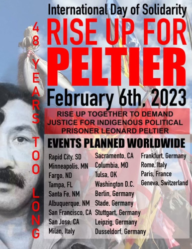 On February 6th, 2023 Leonard Peltier enters into his 48th year of incarceration. In cities and towns across the US and in many countries worldwide, human rights defenders are joining rallies on February 6th for “Day of Solidarity with Leonard Peltier” urgently calling on President Biden to grant Leonard Peltier CLEMENCY NOW! BEFORE IT’S TOO LATE!