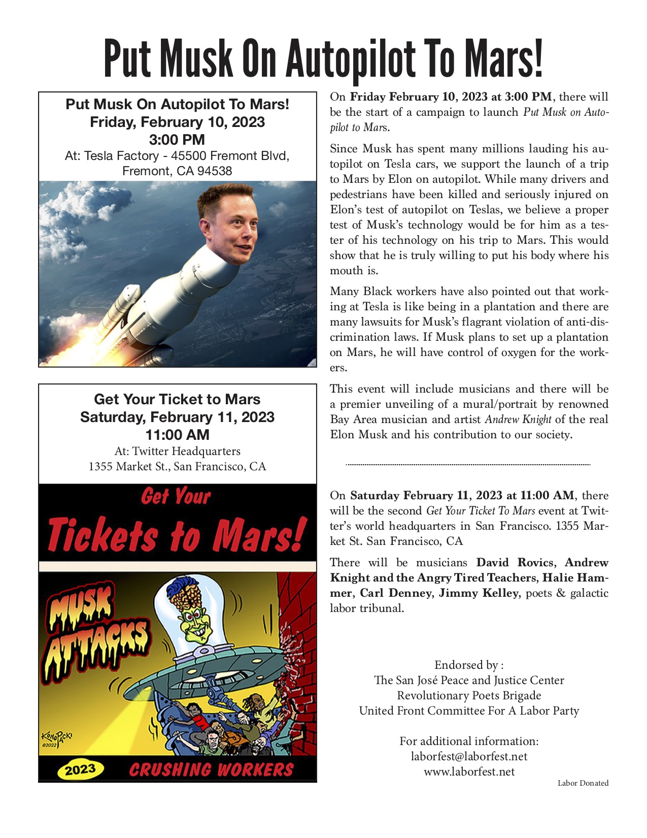 This event will include musicians and there will be a premier unveiling of a mural/portrait by renowned Bay Area musician and artist Andrew Knight of the real Elon Musk and his contribution to our society.