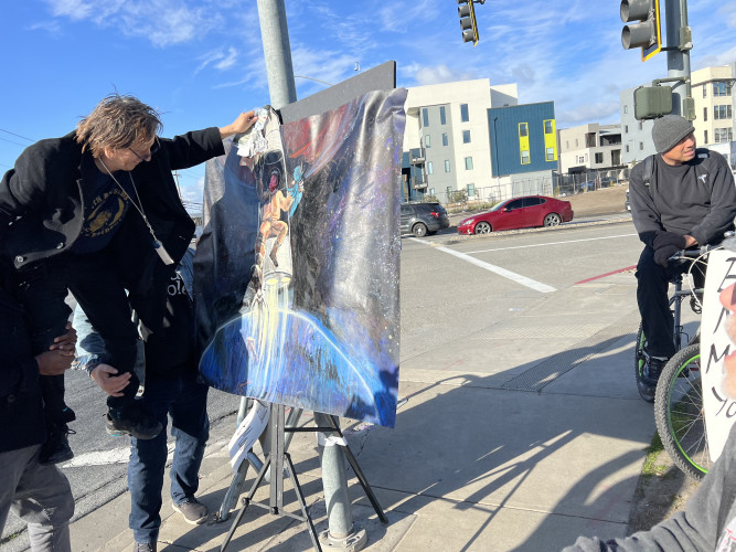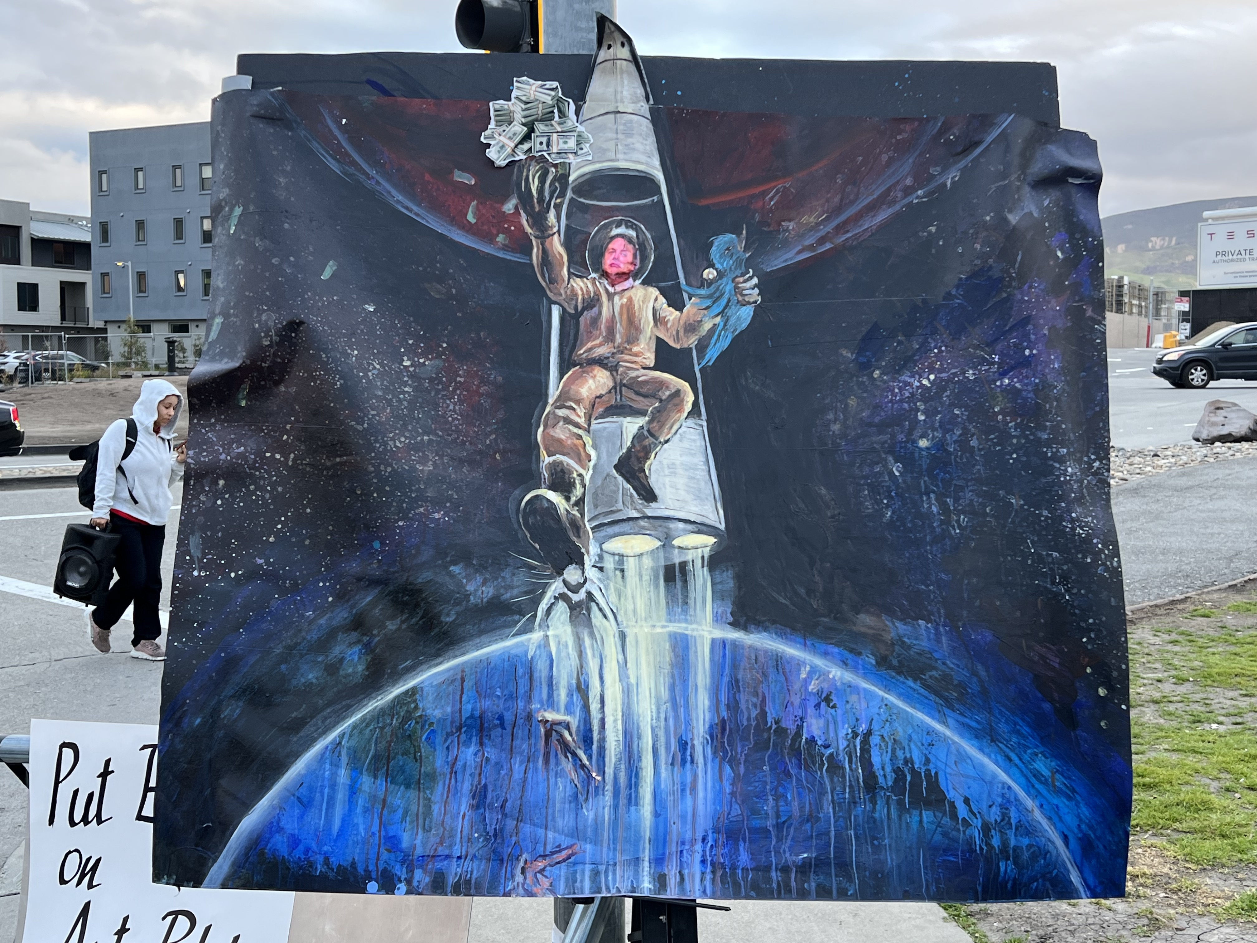 A campaign kickoff to send Elon to Mars on autopilot took place at the Tesla Fremont auto plant where 20,000 workers toil under slave like conditions. Black workers say it is like working at a plantation. The first unveiling of Elon's Rocketship to Mars painting by Bay Area artist Andrew Kong Knight also took place and the Angry Tired Teachers performed for the Tesla workers.