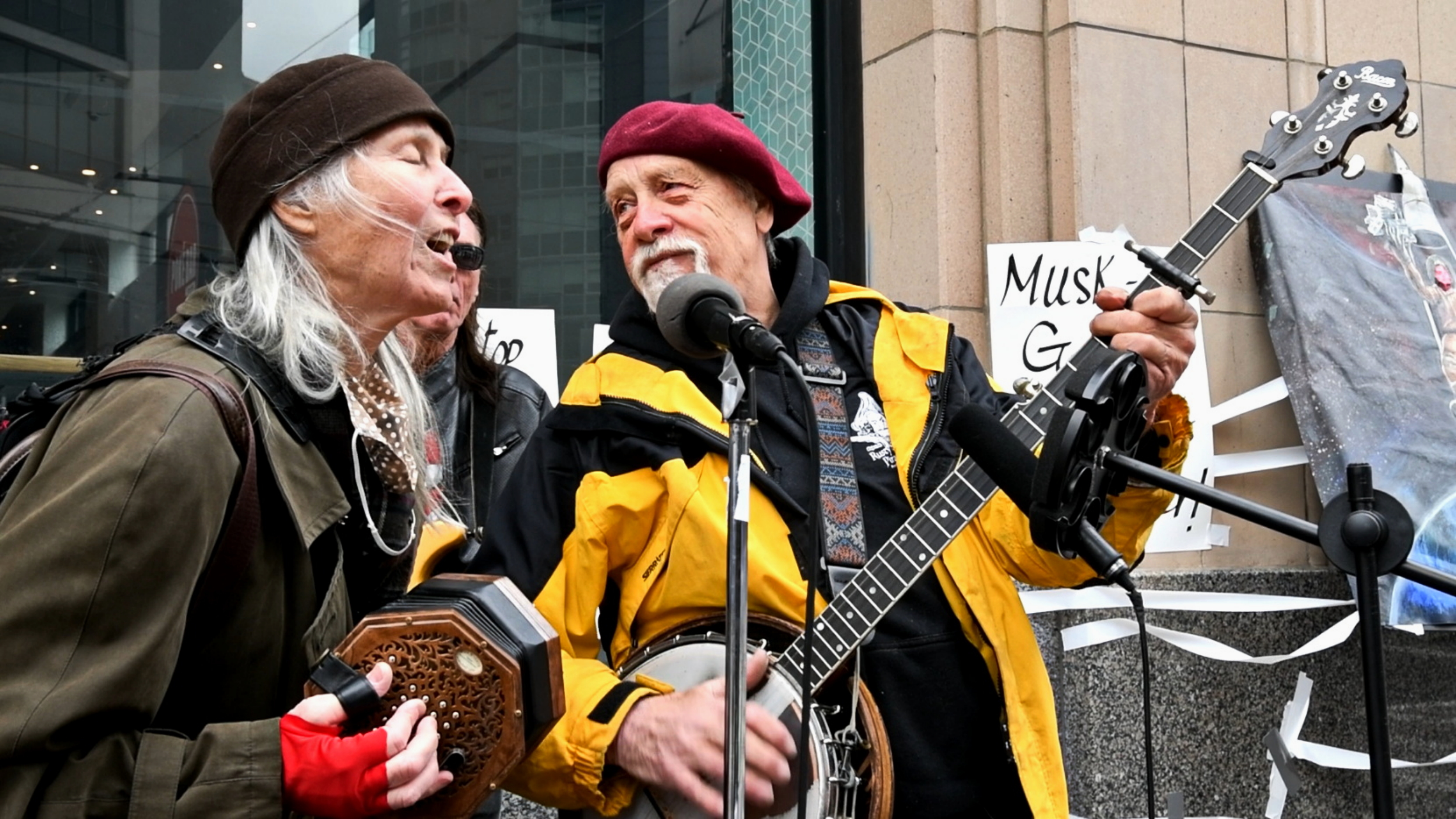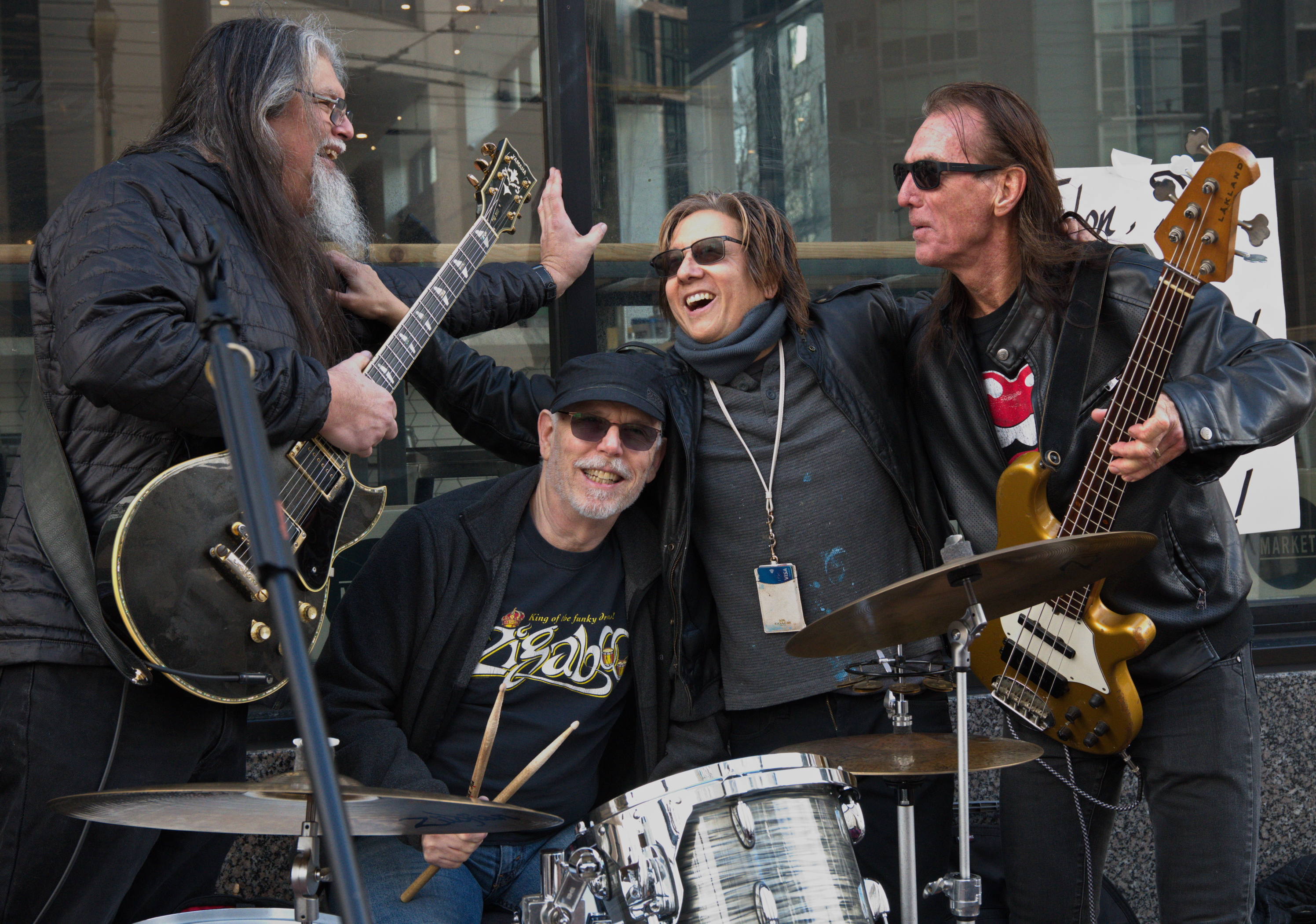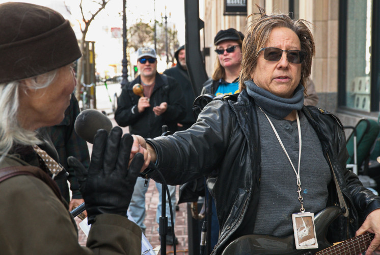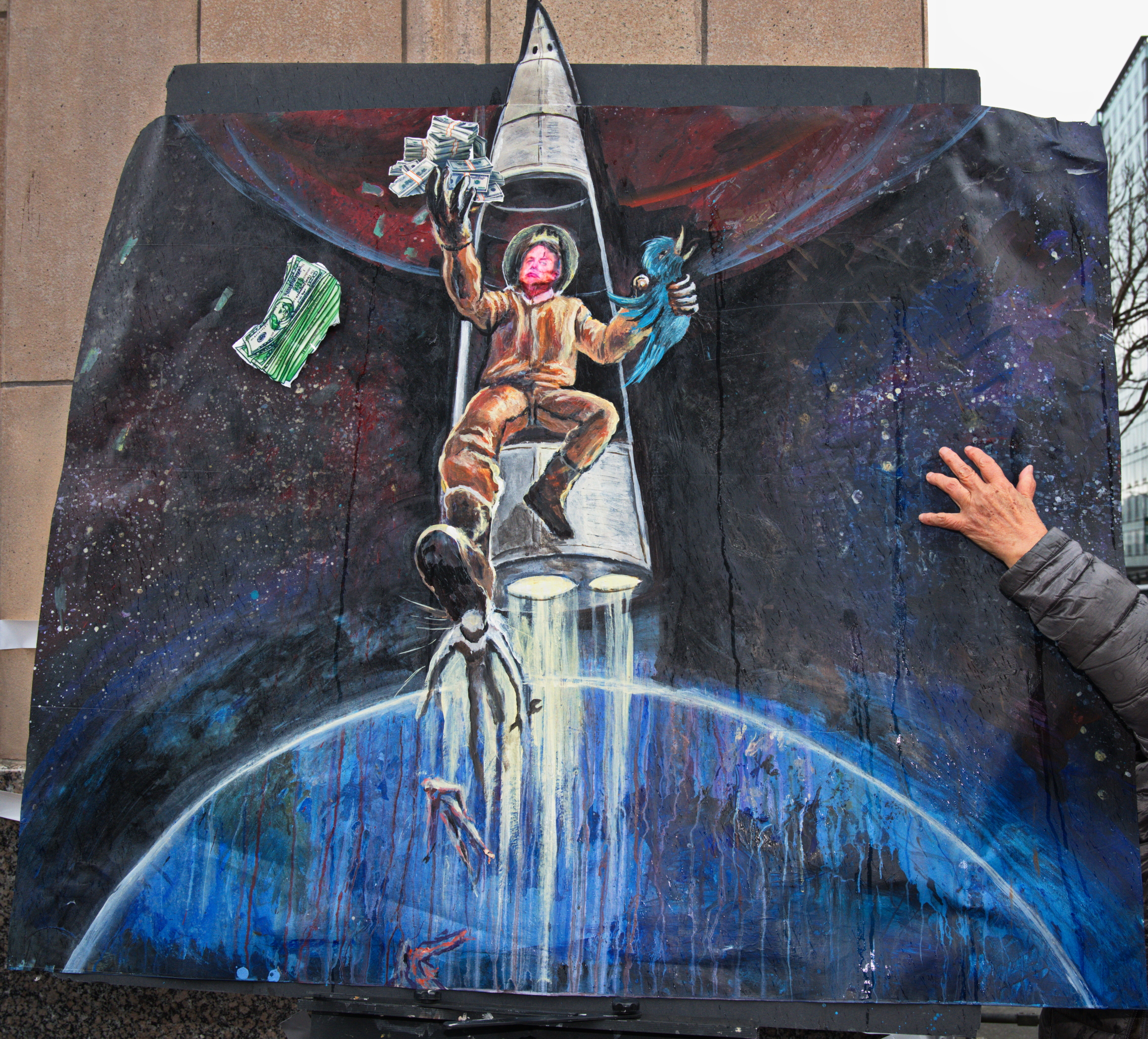 Feb. 11, San Francisco. On a cold Saturday morning in front of Twitter's Market Street Headquarters, a concert, art exhibit and poetry reading punctuated the quiet downtown. The Angry Teachers Band gave a polished performance of a quality many would pay to attend. A painting by lead singer and artist Andrew Knight showing Musk off to Mars was unveiled.There was poetry by the Revolutionary Poets Brigade and folk songs.